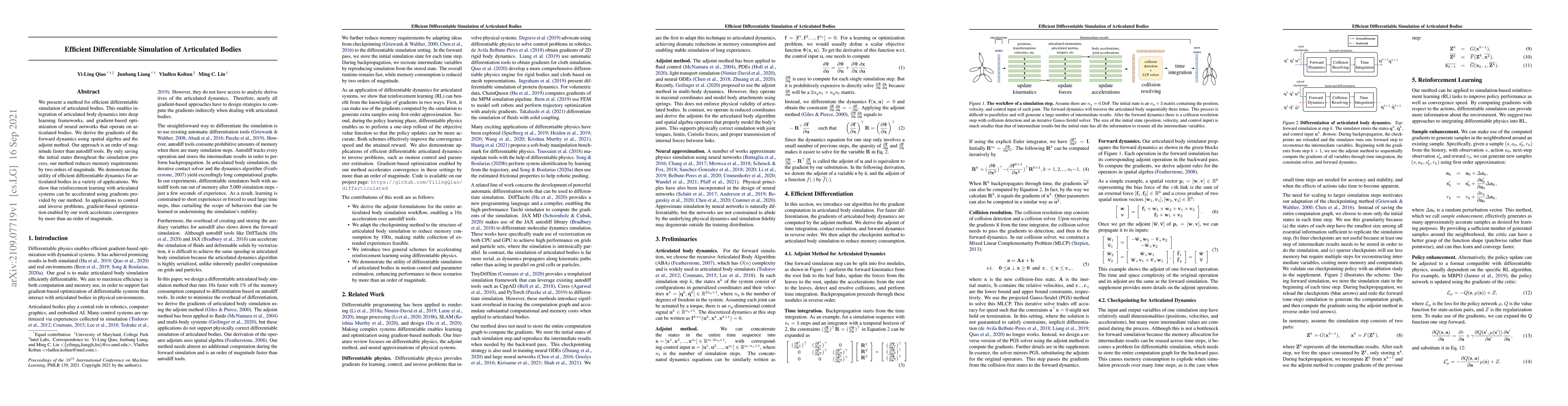 This paper introduces a method for efficiently simulating articulated bodies using differentiable simulation, significantly speeding up gradient-based optimization in deep learning frameworks. The approach leverages spatial algebra and the adjoint method, reducing memory usage and computational time by orders of magnitude compared to traditional autodiff tools.