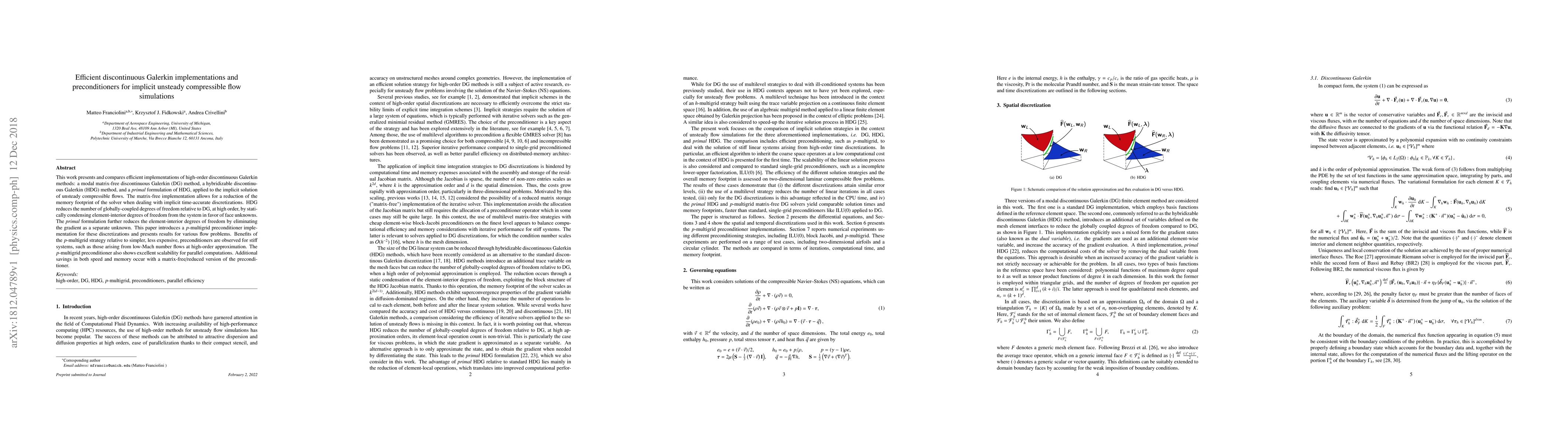 This paper compares high-order discontinuous Galerkin methods for implicit unsteady compressible flow simulations, highlighting efficient implementations and a $p$-multigrid preconditioner. The matrix-free DG method reduces memory usage, while hybridizable DG and its primal form reduce globally-coupled degrees of freedom, showing benefits for stiff systems and excellent scalability in parallel computations.