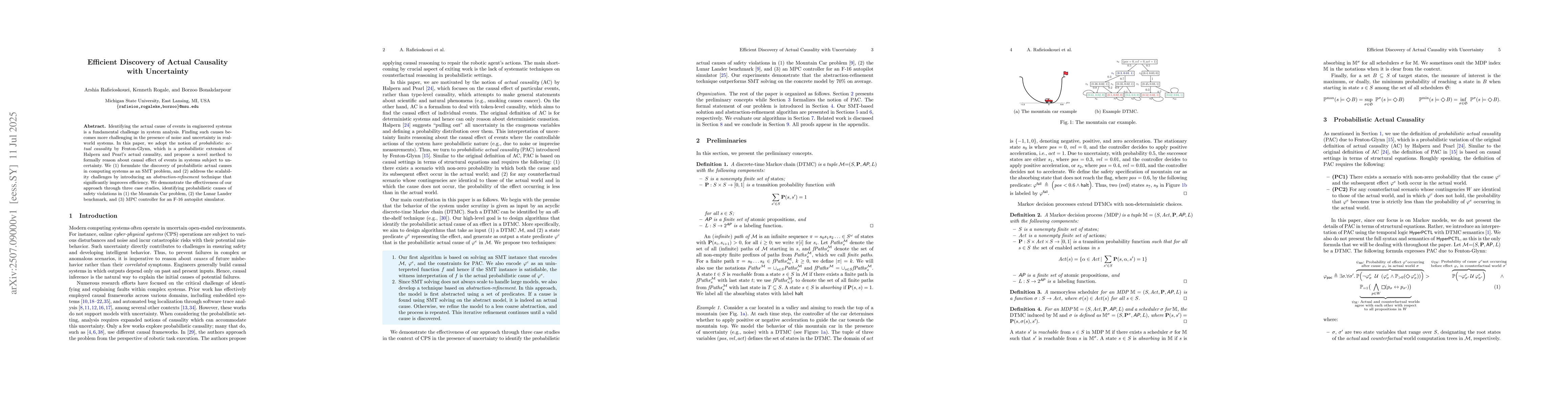 Identifying the actual cause of events in engineered systems is a fundamental challenge in system analysis. Finding such causes becomes more challenging in the presence of noise and uncertainty in real-world systems. In this paper, we adopt the notion of probabilistic actual causality by Fenton-Glynn, which is a probabilistic extension of Halpern and Pearl's actual causality, and propose a novel method to formally reason about causal effect of events in systems subject to uncertainty. We (1) formulate the discovery of probabilistic actual causes in computing systems as an SMT problem, and (2) address the scalability challenges by introducing an abstraction-refinement technique that significantly improves efficiency. We demonstrate the effectiveness of our approach through three case studies, identifying probabilistic causes of safety violations in (1) the Mountain Car problem, (2) the Lunar Lander benchmark, and (3) MPC controller for an F-16 autopilot simulator.