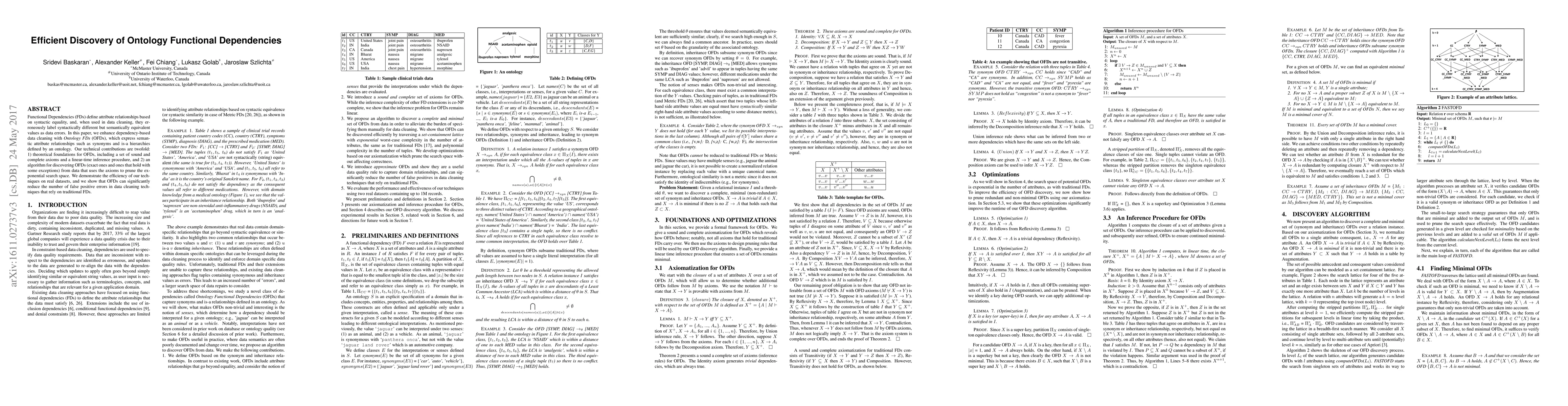 This paper introduces Ontology Functional Dependencies (OFDs) to extend data cleaning techniques by modeling broader relationships defined by ontologies, beyond traditional functional dependencies. It presents algorithms for discovering OFDs and optimizations for efficient computation, demonstrating scalability and accuracy through experiments.