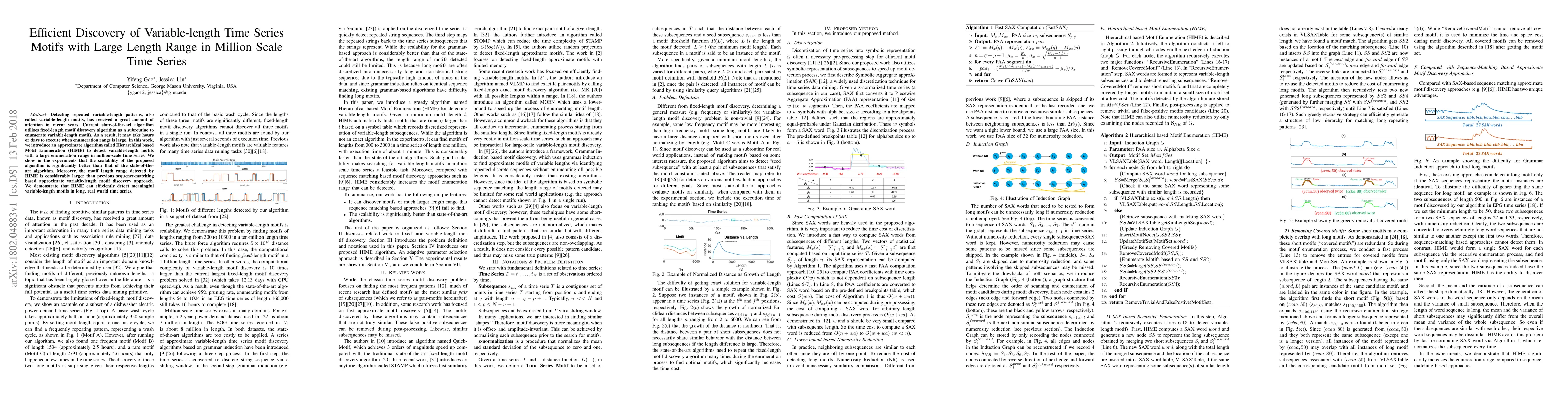 This paper introduces HIME, an efficient approximate algorithm for discovering variable-length motifs in large-scale time series data. HIME significantly outperforms existing methods in scalability and can detect motifs over a much larger length range, proving effective for real-world applications.