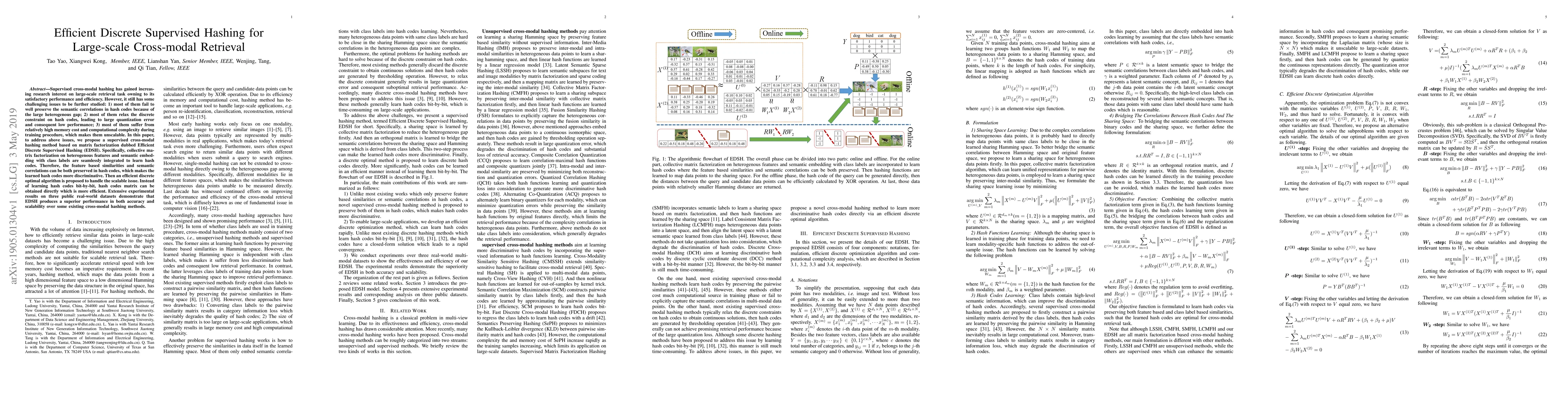 This paper proposes Efficient Discrete Supervised Hashing (EDSH) to address challenges in supervised cross-modal hashing, including preserving semantic correlations and reducing quantization errors. EDSH integrates matrix factorization and semantic embedding to learn discriminative hash codes efficiently.