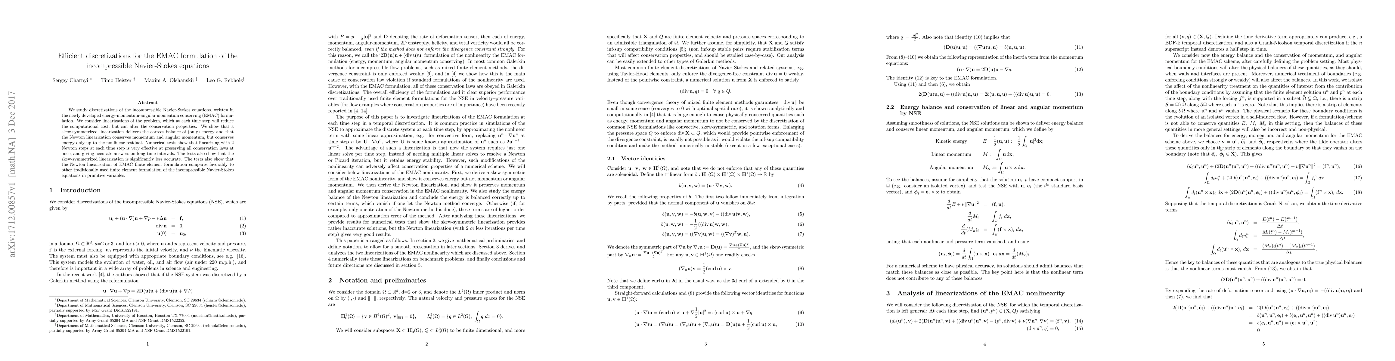 This paper investigates efficient discretizations for the EMAC formulation of the incompressible Navier-Stokes equations, focusing on linearizations that reduce computational cost while maintaining conservation properties. The study finds that a skew-symmetrized linearization conserves energy, while the Newton linearization conserves momentum and angular momentum, though only approximately conserves energy.
