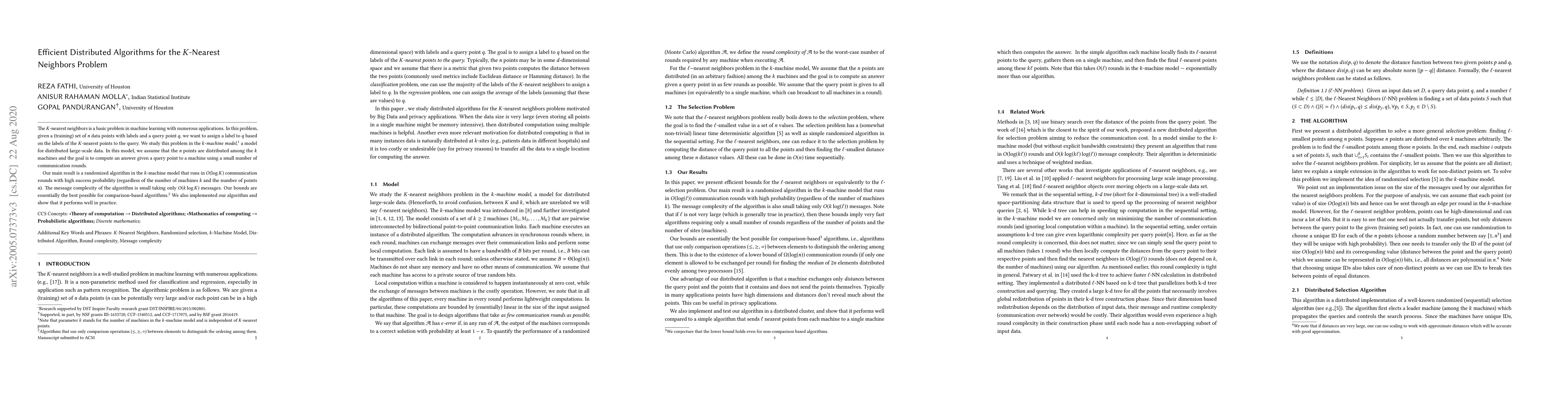 This paper presents an efficient randomized algorithm for solving the $K$-nearest neighbors problem in a distributed $k$-machine model, achieving $O(\log K)$ communication rounds and $O(k\log K)$ message complexity. The algorithm's performance is shown to be optimal for comparison-based methods and is demonstrated to outperform a practical alternative in experiments.