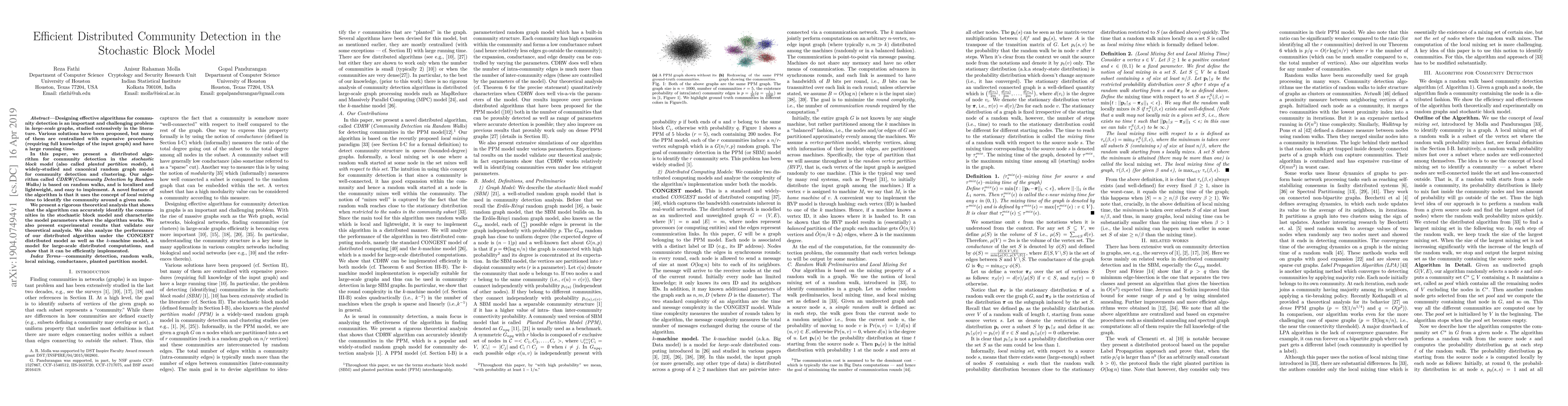 This paper introduces a distributed algorithm named CDRW for community detection in the stochastic block model, leveraging random walks and local mixing time. The algorithm is efficient, lightweight, and validated through theoretical analysis and experiments, demonstrating effective performance in large-scale distributed computations.