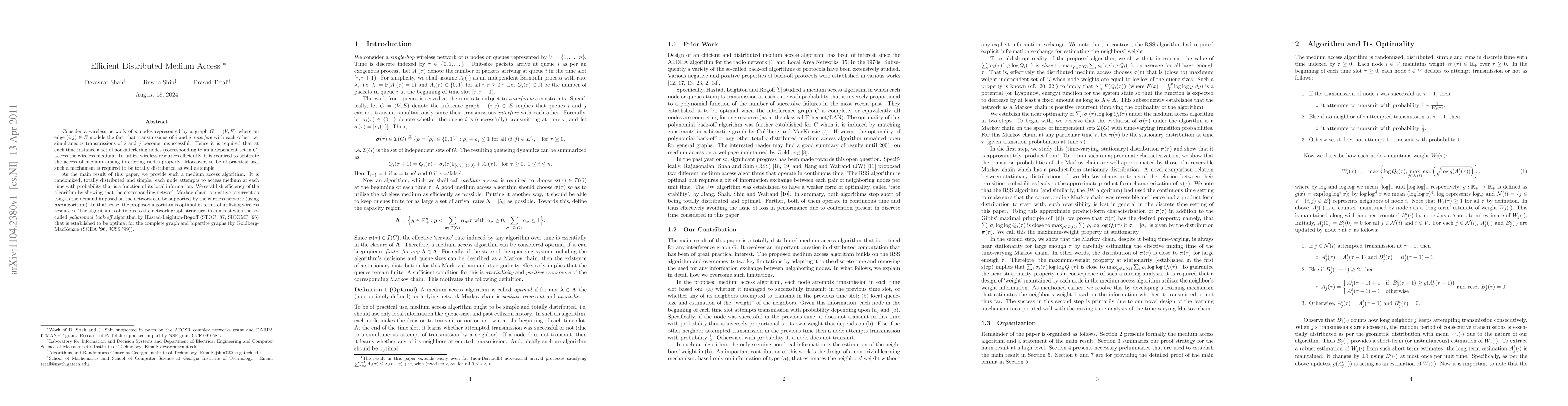 This research paper proposes an efficient distributed medium access algorithm for wireless networks, showing that it is both optimal in utilizing wireless resources and simple, yet randomized and totally distributed.