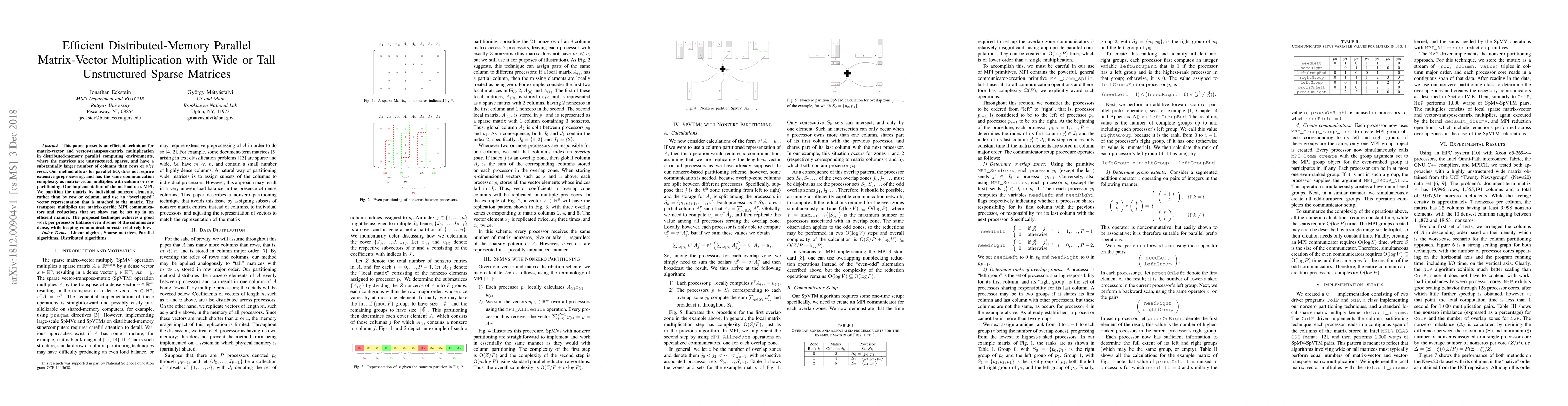 This paper introduces an efficient parallel technique for matrix-vector multiplication in distributed-memory systems, focusing on wide or tall unstructured sparse matrices. The method leverages MPI, partitions matrices by individual nonzero elements, and employs an overlapped vector representation to achieve balanced workload and low communication costs.