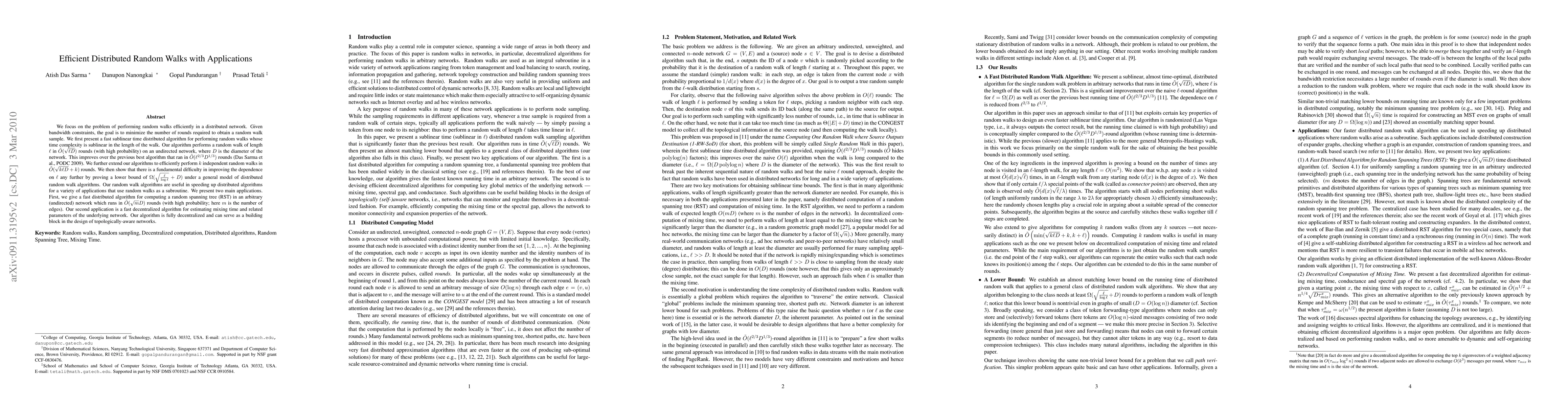 This paper presents a fast sublinear time distributed algorithm for performing random walks in networks, achieving $\tilde{O}(\sqrt{\ell D})$ rounds, significantly improving previous algorithms. The authors also extend the algorithm for multiple walks and discuss fundamental limits on improving $\ell$ dependence. The proposed methods are applied to compute random spanning trees and estimate network mixing times efficiently.