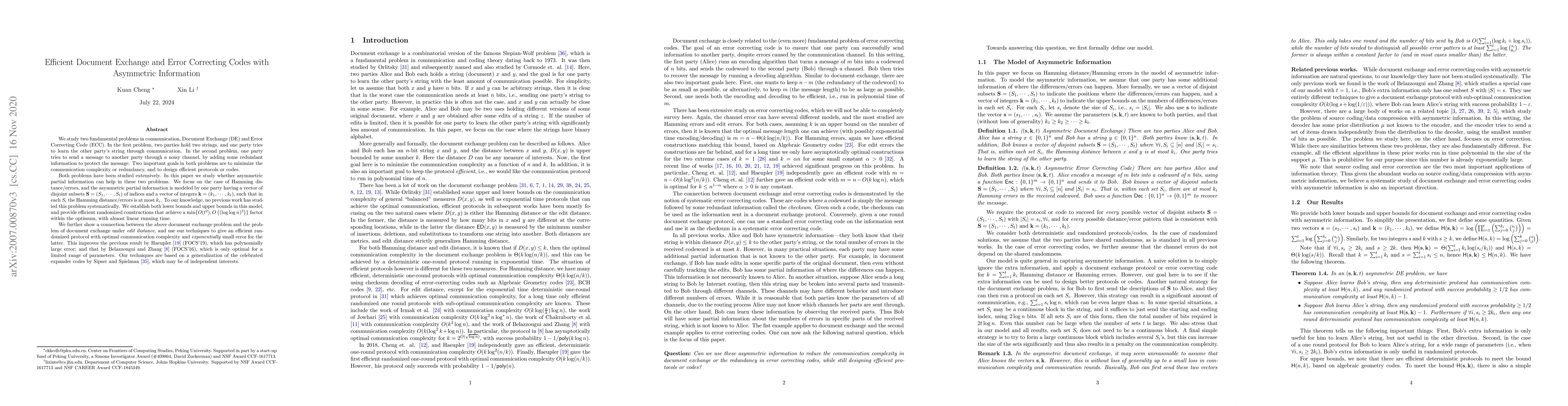 This paper investigates how asymmetric partial information can optimize communication complexity in Document Exchange and Error Correcting Codes, particularly under Hamming distance. It establishes efficient randomized constructions achieving near-optimal performance with almost linear runtime, and improves upon previous results for document exchange under edit distance.