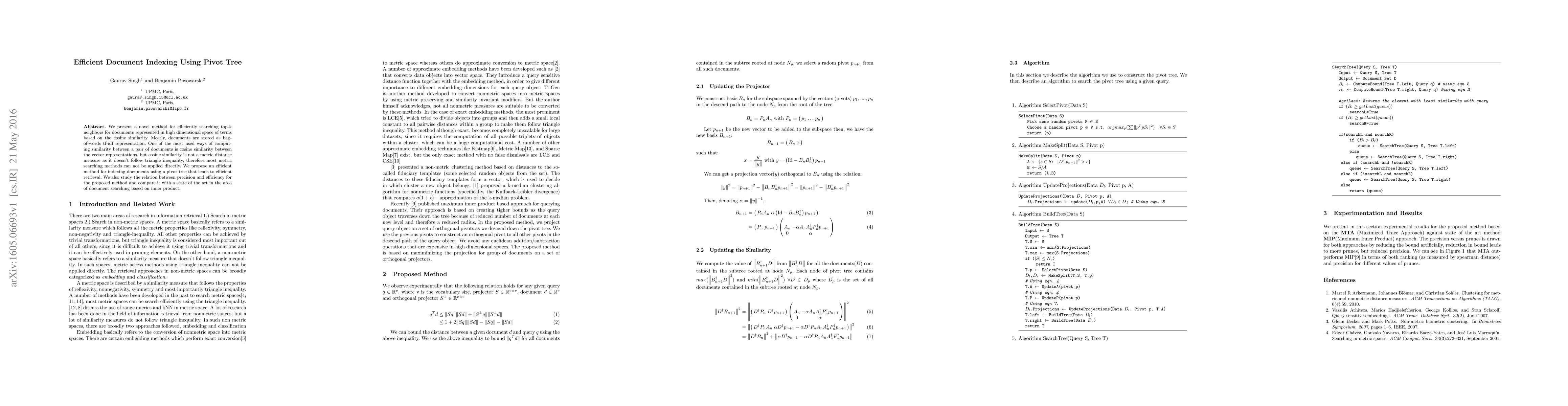 This paper introduces a pivot tree method for efficiently indexing and searching high-dimensional document vectors based on cosine similarity. The proposed method enables effective retrieval of top-k neighbors, addressing the limitations of cosine similarity in metric searching, and is compared against the state-of-the-art for document searching based on inner product.