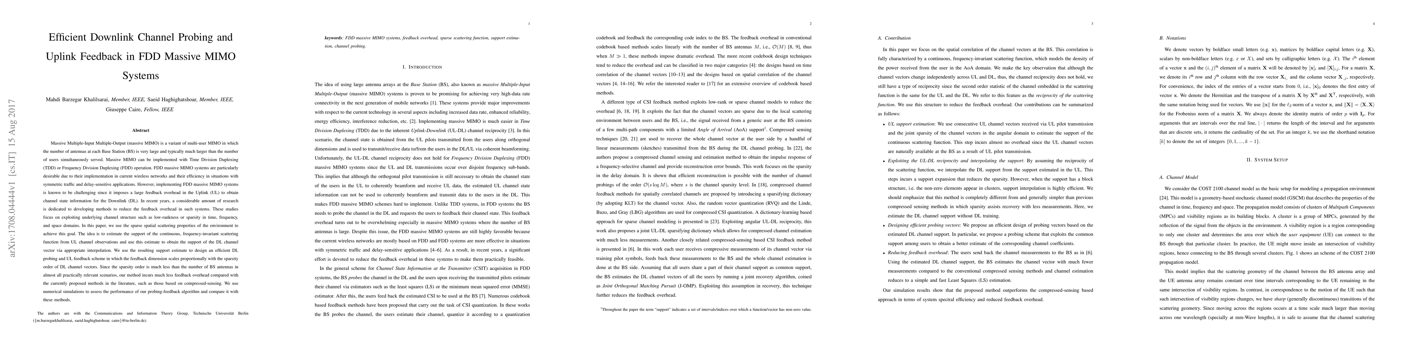 This paper proposes an efficient method for downlink channel probing and uplink feedback in FDD massive MIMO systems by leveraging the sparse spatial scattering properties of the environment. The method estimates the support of the DL channel vector from UL observations and uses it to reduce feedback overhead, significantly outperforming existing methods based on compressed-sensing.