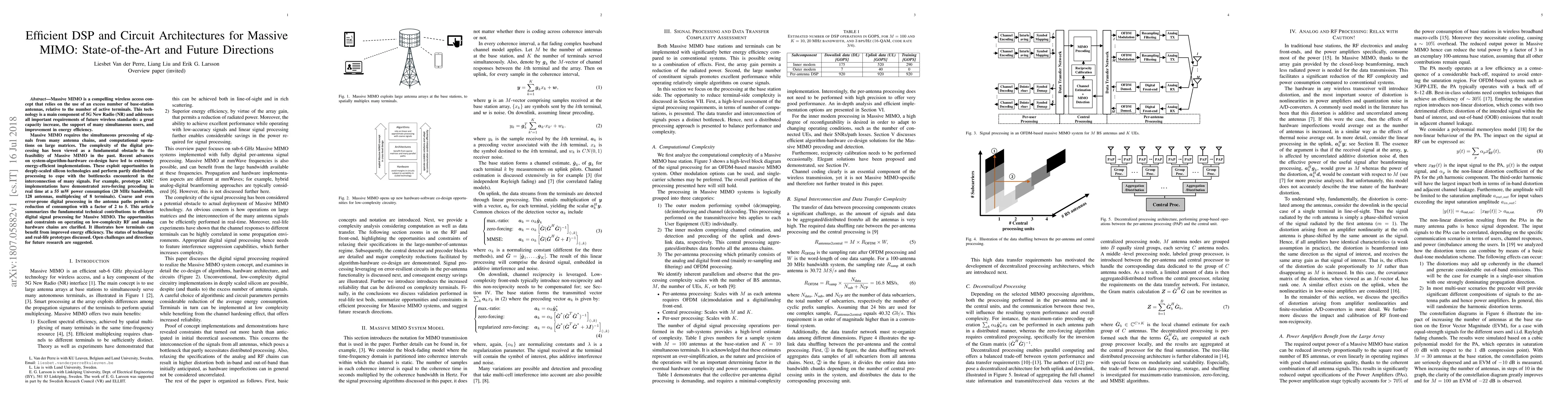 This paper discusses efficient digital signal processing for Massive MIMO technology, which enables 5G New Radio's high capacity and energy efficiency. Recent advances have led to highly energy-efficient implementations using silicon technologies and distributed processing.