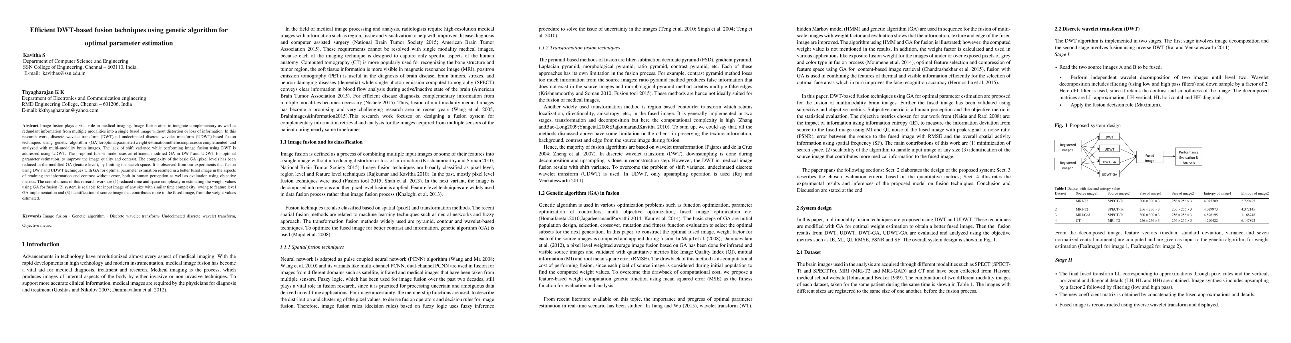 Image fusion plays a vital role in medical imaging. Image fusion aims to integrate complementary as well as redundant information from multiple modalities into a single fused image without distortion or loss of information. In this research work, discrete wavelet transform (DWT)and undecimated discrete wavelet transform (UDWT)-based fusion techniques using genetic algorithm (GA)foroptimalparameter(weight)estimationinthefusionprocessareimplemented and analyzed with multi-modality brain images. The lack of shift variance while performing image fusion using DWT is addressed using UDWT. The proposed fusion model uses an efficient, modified GA in DWT and UDWT for optimal parameter estimation, to improve the image quality and contrast. The complexity of the basic GA (pixel level) has been reduced in the modified GA (feature level), by limiting the search space. It is observed from our experiments that fusion using DWT and UDWT techniques with GA for optimal parameter estimation resulted in a better fused image in the aspects of retaining the information and contrast without error, both in human perception as well as evaluation using objective metrics. The contributions of this research work are (1) reduced time and space complexity in estimating the weight values using GA for fusion (2) system is scalable for input image of any size with similar time complexity, owing to feature level GA implementation and (3) identification of source image that contributes more to the fused image, from the weight values estimated.