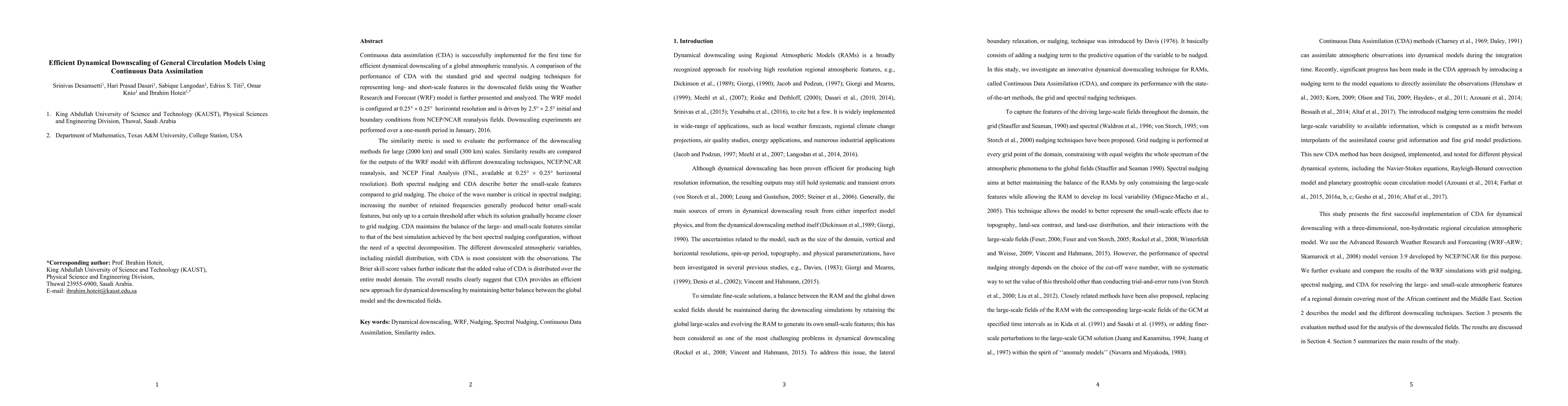 Continuous data assimilation (CDA) is successfully implemented for the first time for efficient dynamical downscaling of a global atmospheric reanalysis. A comparison of the performance of CDA with the standard grid and spectral nudging techniques for representing long- and short-scale features in the downscaled fields using the Weather Research and Forecast (WRF) model is further presented and analyzed. The WRF model is configured at 25km horizontal resolution and is driven by 250km initial and boundary conditions from NCEP/NCAR reanalysis fields. Downscaling experiments are performed over a one-month period in January, 2016. The similarity metric is used to evaluate the performance of the downscaling methods for large and small scales. Similarity results are compared for the outputs of the WRF model with different downscaling techniques, NCEP reanalysis, and Final Analysis. Both spectral nudging and CDA describe better the small-scale features compared to grid nudging. The choice of the wave number is critical in spectral nudging; increasing the number of retained frequencies generally produced better small-scale features, but only up to a certain threshold after which its solution gradually became closer to grid nudging. CDA maintains the balance of the large- and small-scale features similar to that of the best simulation achieved by the best spectral nudging configuration, without the need of a spectral decomposition. The different downscaled atmospheric variables, including rainfall distribution, with CDA is most consistent with the observations. The Brier skill score values further indicate that the added value of CDA is distributed over the entire model domain. The overall results clearly suggest that CDA provides an efficient new approach for dynamical downscaling by maintaining better balance between the global model and the downscaled fields.