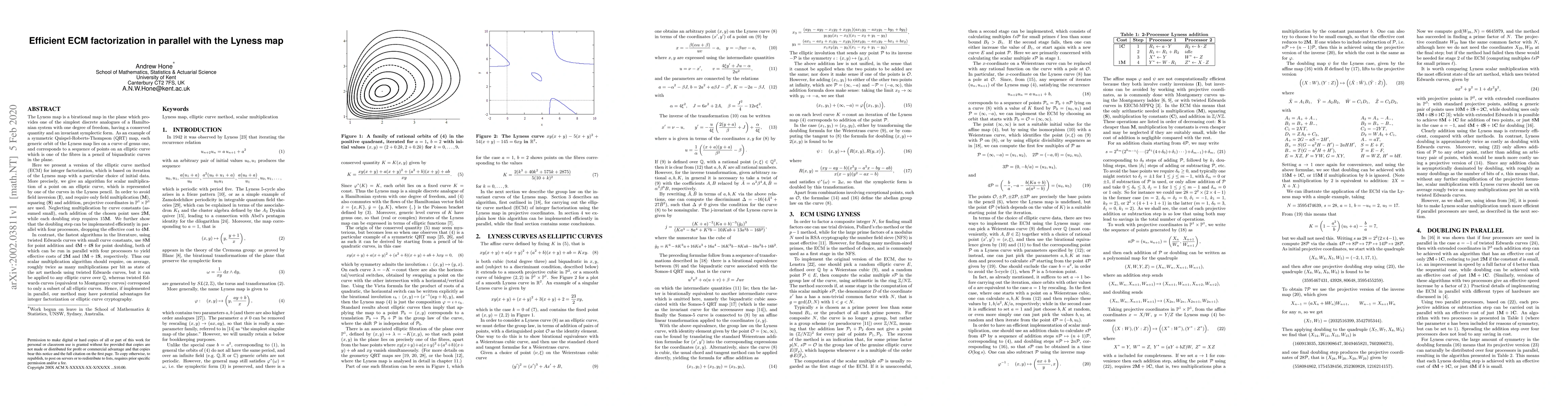The Lyness map is a birational map in the plane which provides one of the simplest discrete analogues of a Hamiltonian system with one degree of freedom, having a conserved quantity and an invariant symplectic form. As an example of a symmetric Quispel-Roberts-Thompson (QRT) map, each generic orbit of the Lyness map lies on a curve of genus one, and corresponds to a sequence of points on an elliptic curve which is one of the fibres in a pencil of biquadratic curves in the plane. Here we present a version of the elliptic curve method (ECM) for integer factorization, which is based on iteration of the Lyness map with a particular choice of initial data. More precisely, we give an algorithm for scalar multiplication of a point on an elliptic curve, which is represented by one of the curves in the Lyness pencil. In order to avoid field inversion, and require only field multiplication (${\bf M}$), squaring (${\bf S}$) and addition, projective coordinates in $\mathbb{P}^1 \times \mathbb{P}^1$ are used. Neglecting multiplication by curve constants (assumed small), each addition of the chosen point uses $2{\bf M}$, while each doubling step requires $15{\bf M}$. We further show that the doubling step can be implemented efficiently in parallel with four processors, dropping the effective cost to $4{\bf M}$. Our scalar multiplication algorithm should require, on average, roughly twice as many multiplications per bit as the fastest state of the art methods using twisted Edwards curves with small constants, but it can be applied to any elliptic curve over $\mathbb{Q}$, whereas twisted Edwards curves (equivalent to Montgomery curves) correspond to only a subset of all elliptic curves. Hence, if implemented in parallel, our method may have potential advantages for integer factorization or elliptic curve cryptography.