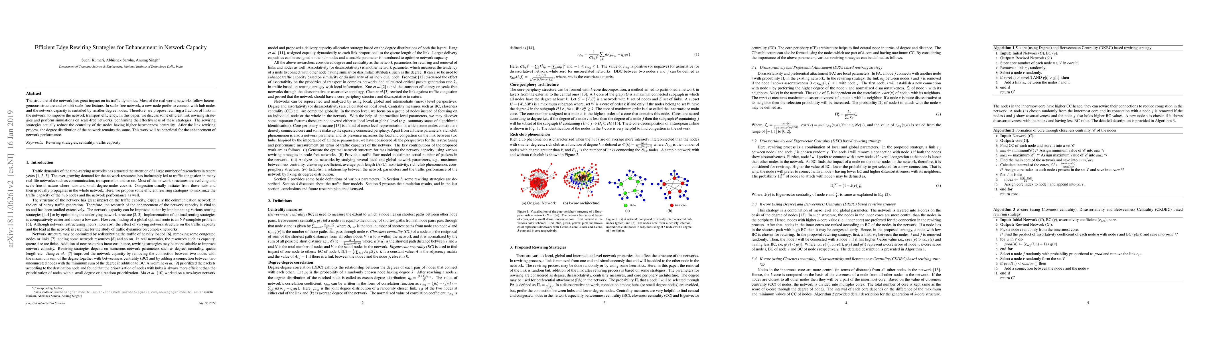 The structure of the network has great impact on its traffic dynamics. Most of the real world networks follow the heterogeneous structure and exhibit scale-free feature. In scale-free network, a new node prefers to connect with hub nodes and the network capacity is curtailed by smaller degree nodes. Therefore, we propose rewiring a fraction of links in the network, to improve the network transport efficiency. In this paper, we discuss some efficient link rewiring strategies and perform simulations on scale-free networks, confirming the effectiveness of these strategies. The rewiring strategies actually reduce the centrality of the nodes having higher betweenness centrality. After the link rewiring process, the degree distribution of the network remains the same. This work will be beneficial for the enhancement of network performance.