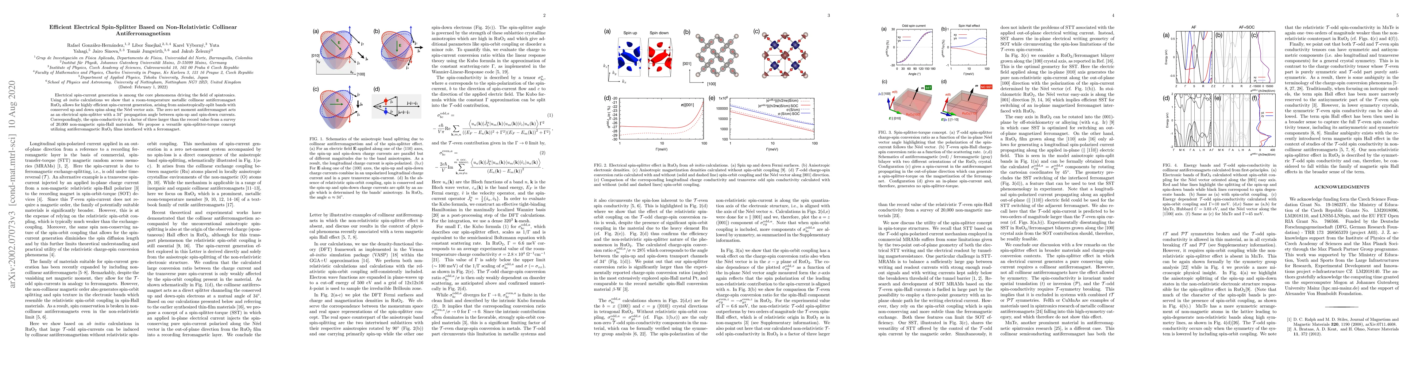 Electrical spin-current generation is among the core phenomena driving the field of spintronics. Using {\em ab initio} calculations we show that a room-temperature metallic collinear antiferromagnet RuO$_2$ allows for highly efficient spin-current generation, arising from anisotropically-split bands with conserved up and down spins along the N\'eel vector axis. The zero net moment antiferromagnet acts as an electrical spin-splitter with a 34$^\circ$ propagation angle between spin-up and spin-down currents. Correspondingly, the spin-conductivity is a factor of three larger than the record value from a survey of 20,000 non-magnetic spin-Hall materials. We propose a versatile spin-splitter-torque concept utilizing antiferromagnetic RuO$_2$ films interfaced with a ferromagnet.