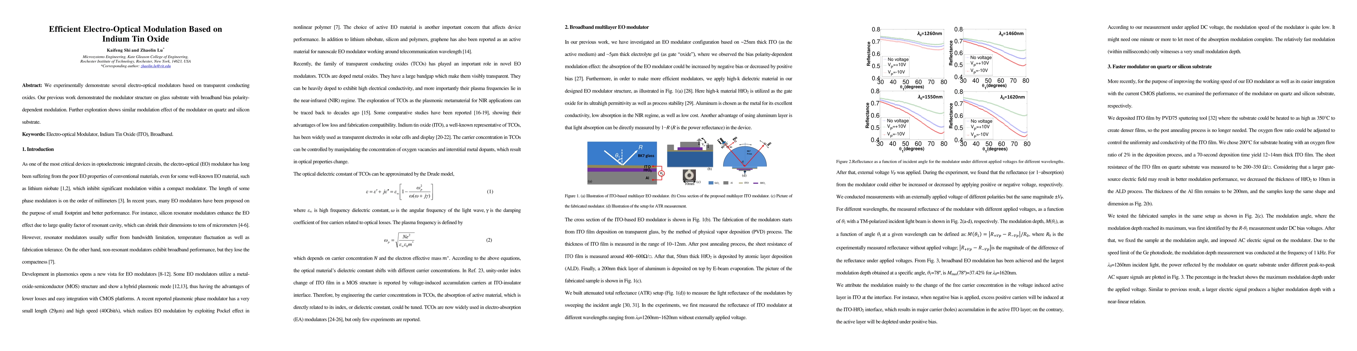 Summary: This research demonstrates efficient electro-optical modulators using transparent conducting oxides, with a focus on indium tin oxide. The study extends previous findings by showing consistent modulation effects across different substrates including glass, quartz, and silicon.