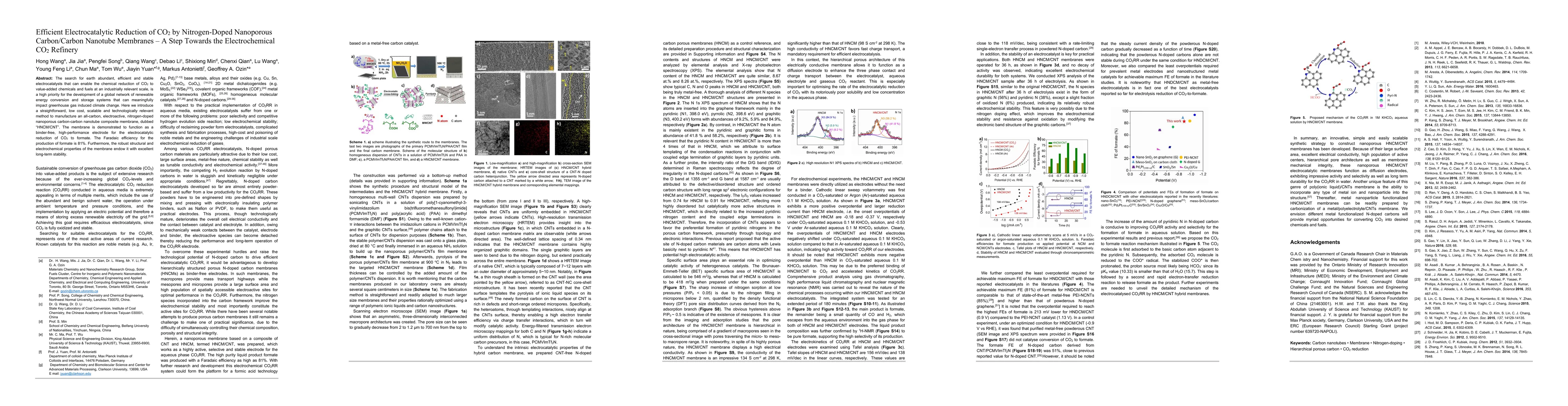 This paper presents a low-cost, scalable nitrogen-doped nanoporous carbon-carbon nanotube membrane for efficient electrocatalytic reduction of CO2 to formate, achieving a high Faradaic efficiency of 81% and demonstrating long-term stability. The membrane, termed "HNCM-CNT," offers a promising solution for industrial CO2 conversion.