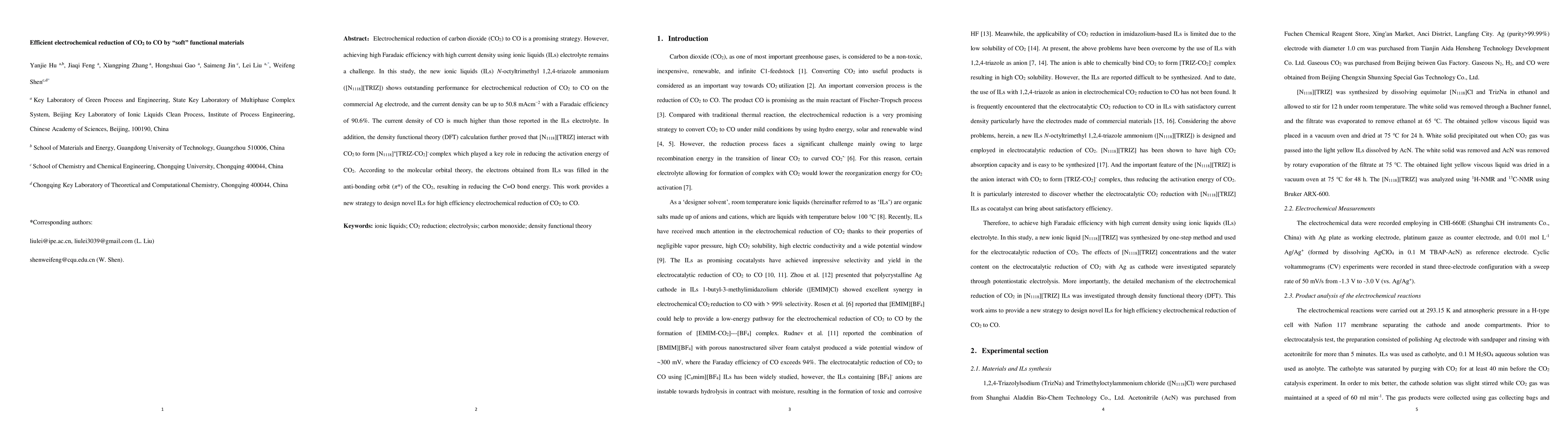 Electrochemical reduction of CO2 to CO is a promising strategy. However, achieving high Faradaic efficiency with high current density using ILs electrolyte remains a challenge. In this study, the IL N octyltrimethyl 1,2,4 triazole ammonium shows outstanding performance for electrochemical reduction of CO2 to CO on the commercial Ag electrode, and the current density can be up to 50.8 mA cm-2 with a Faradaic efficiency of 90.6%. The current density of CO is much higher than those reported in the ILs electrolyte. In addition, the density functional theory calculation further proved that IL interacts with CO2 to form IL CO2 complex which played a key role in reducing the activation energy of CO2. According to the molecular orbital theory, the electrons obtained from ILs was filled in the anti bonding orbit of the CO2, resulting in reducing the C=O bond energy. This work provides a new strategy to design novel ILs for high efficiency electrochemical reduction of CO2 to CO.