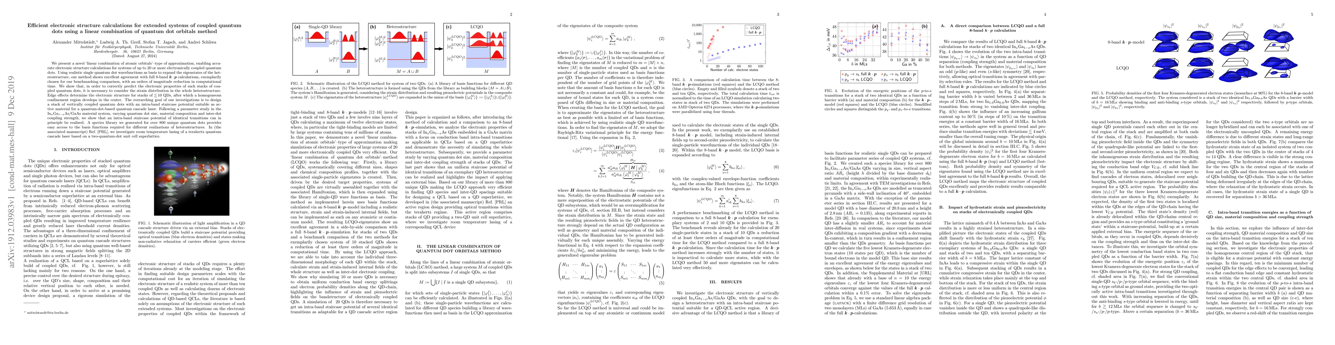 We present a novel "linear combination of atomic orbitals"-type of approximation, enabling accurate electronic structure calculations for systems of up to 20 or more electronically coupled quantum dots. Using realistic single quantum dot wavefunctions as basis to expand the eigenstates of the heterostructure, our method shows excellent agreement with full 8-band $\boldsymbol{k}\cdot\boldsymbol{p}$ calculations, exemplarily chosen for our benchmarking comparison, with an orders of magnitude reduction in computational time. We show that, in order to correctly predict the electronic properties of such stacks of coupled quantum dots, it is necessary to consider the strain distribution in the whole heterostructure. Edge effects determine the electronic structure for stacks of $\lesssim$ 10 QDs, after which a homogeneous confinement region develops in the center. The overarching goal of our investigations is to design a stack of vertically coupled quantum dots with an intra-band staircase potential suitable as active material for a quantum-dot-based quantum cascade laser. Following a parameter study in the In$_{x}$Ga$_{1-x}$As/GaAs material system, varying quantum dot size, material composition and inter-dot coupling strength, we show that an intra-band staircase potential of identical transitions can in principle be realized. A species library we generated for over 800 unique quantum dots provides easy access to the basis functions required for different realizations of heterostructures. In the associated manuscript entitled "Room Temperature Lasing of Terahertz Quantum Cascade Lasers Based on a Quantum Dot Superlattice", we investigate room temperature lasing of a terahertz quantum cascade laser based on a two-quantum-dot unit cell superlattice.