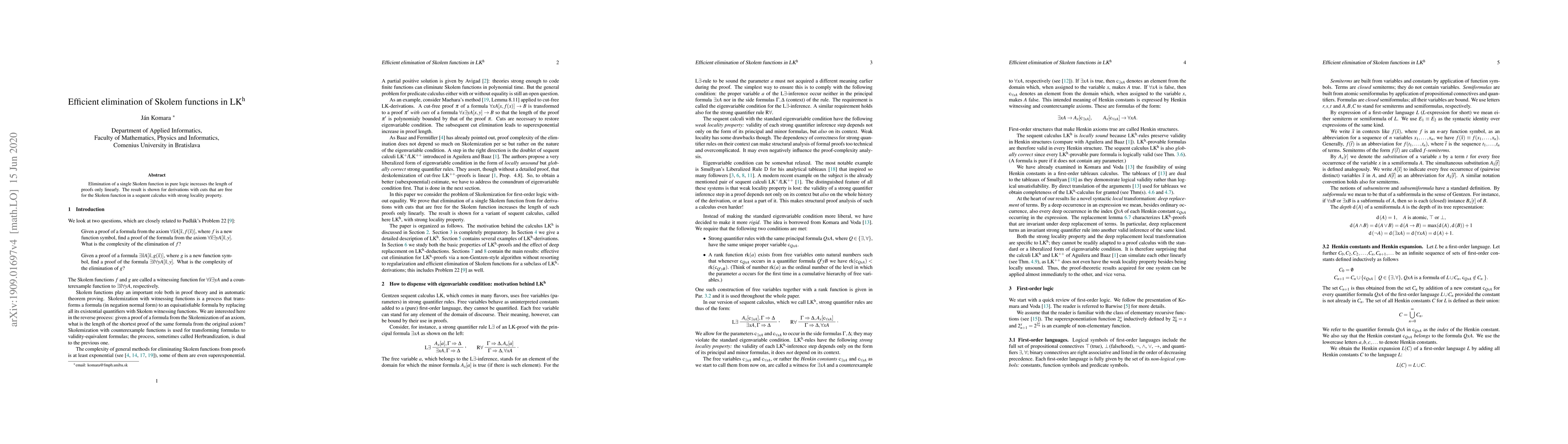 Research shows eliminating a single Skolem function in logic increases proof length only linearly. This result is demonstrated for sequent calculus with strong locality property.