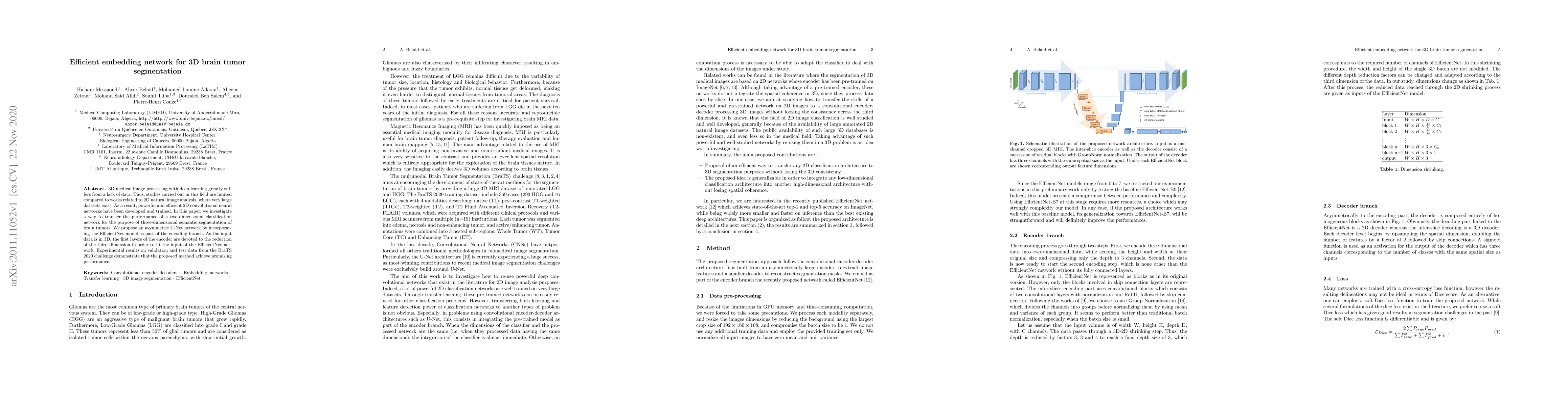 3D medical image processing with deep learning greatly suffers from a lack of data. Thus, studies carried out in this field are limited compared to works related to 2D natural image analysis, where very large datasets exist. As a result, powerful and efficient 2D convolutional neural networks have been developed and trained. In this paper, we investigate a way to transfer the performance of a two-dimensional classiffication network for the purpose of three-dimensional semantic segmentation of brain tumors. We propose an asymmetric U-Net network by incorporating the EfficientNet model as part of the encoding branch. As the input data is in 3D, the first layers of the encoder are devoted to the reduction of the third dimension in order to fit the input of the EfficientNet network. Experimental results on validation and test data from the BraTS 2020 challenge demonstrate that the proposed method achieve promising performance.