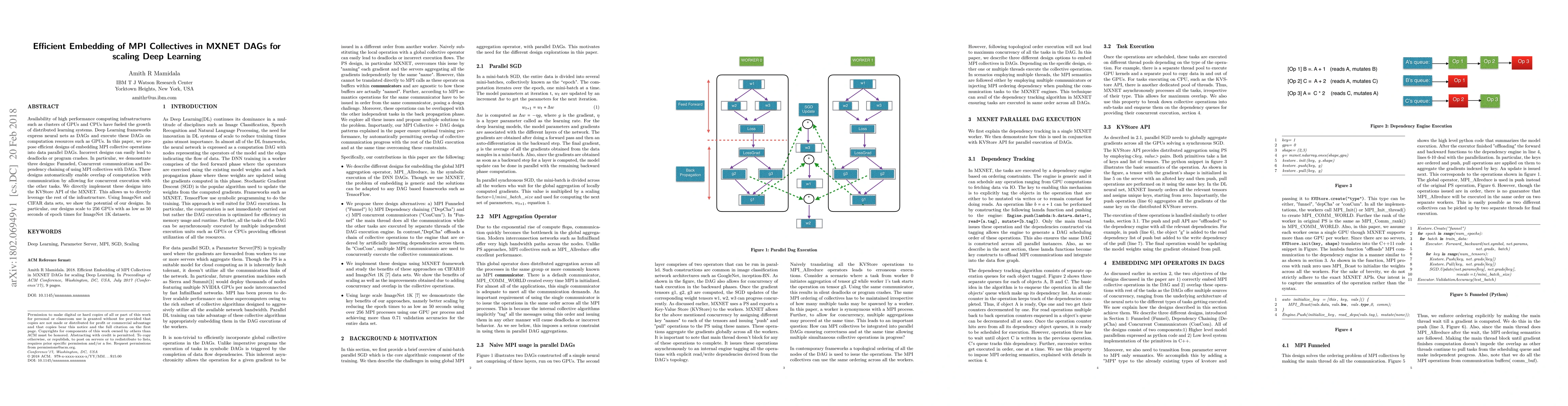 This paper proposes efficient embedding designs for MPI collective operations within MXNET DAGs to enhance distributed deep learning scalability. The authors implement three designs—Funneled, Concurrent communication, and Dependency chaining—to enable computation-communication overlap, demonstrating scalability to 256 GPUs with reduced epoch times.