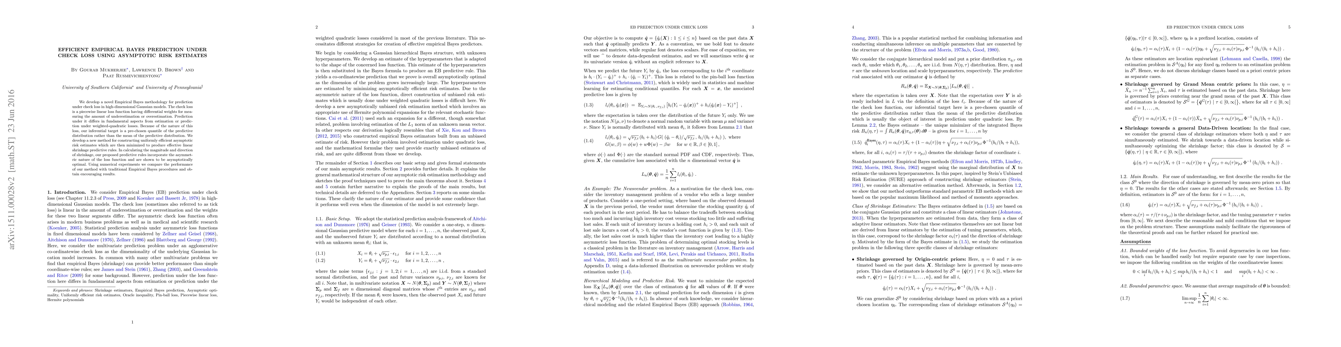 This paper introduces a novel Empirical Bayes approach for prediction under check loss in high-dimensional Gaussian models, focusing on minimizing a new type of risk estimate that accounts for the asymmetric nature of the loss function. The proposed method yields asymptotically optimal linear shrinkage rules and outperforms traditional Empirical Bayes procedures in numerical experiments.
