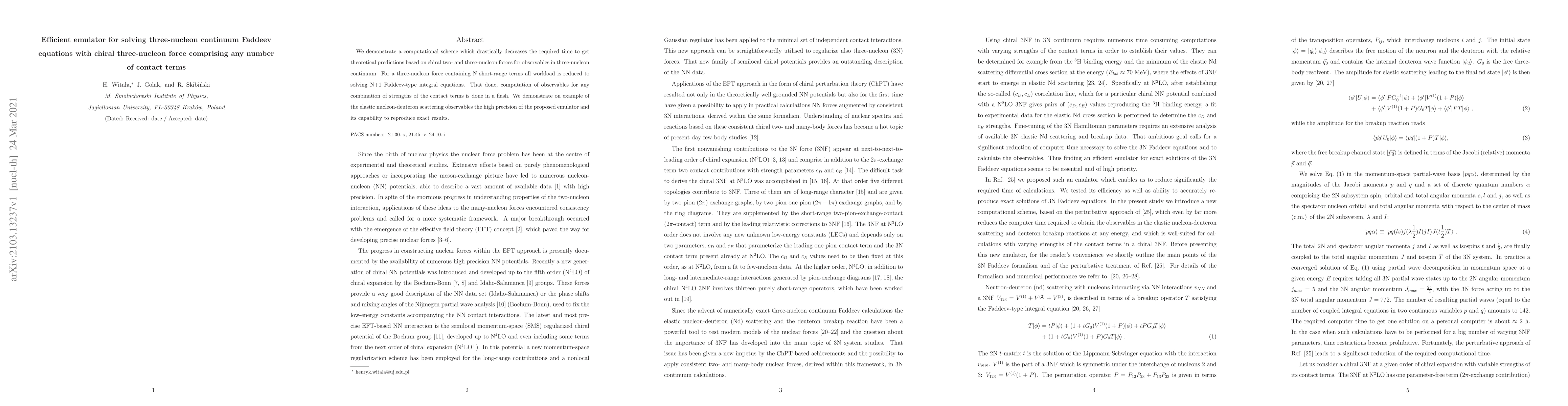 This research introduces an efficient computational method that significantly cuts down the time needed for theoretical predictions using chiral two- and three-nucleon forces, especially for three-nucleon continuum observables. The method reduces workload to solving N+1 Faddeev-type equations for a force with N contact terms, allowing quick computation of observables for any contact term strength combination. The paper validates this emulator with nucleon-deuteron elastic scattering observables, demonstrating high precision and exact result reproduction.