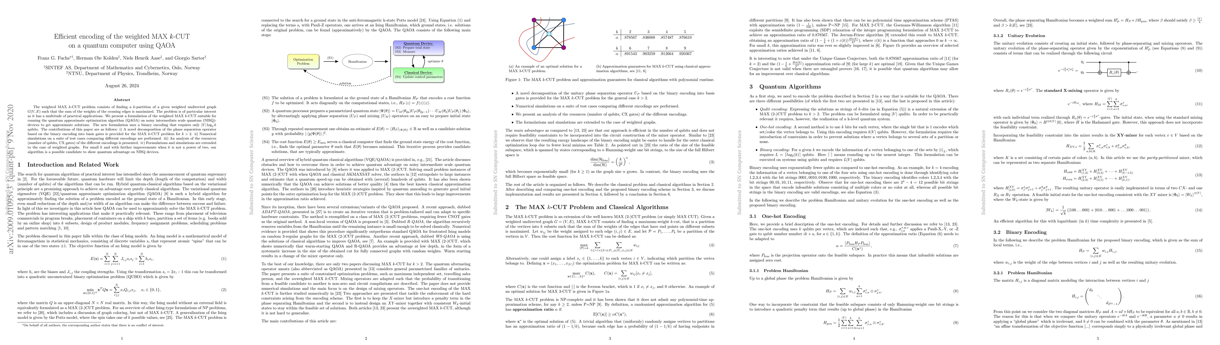 This paper proposes a novel binary encoding for the weighted MAX k-CUT problem, enabling its efficient implementation on quantum computers using the QAOA algorithm. The proposed encoding requires only |V|log_2(k) qubits, and the study demonstrates potential quantum advantage for small k on NISQ devices.