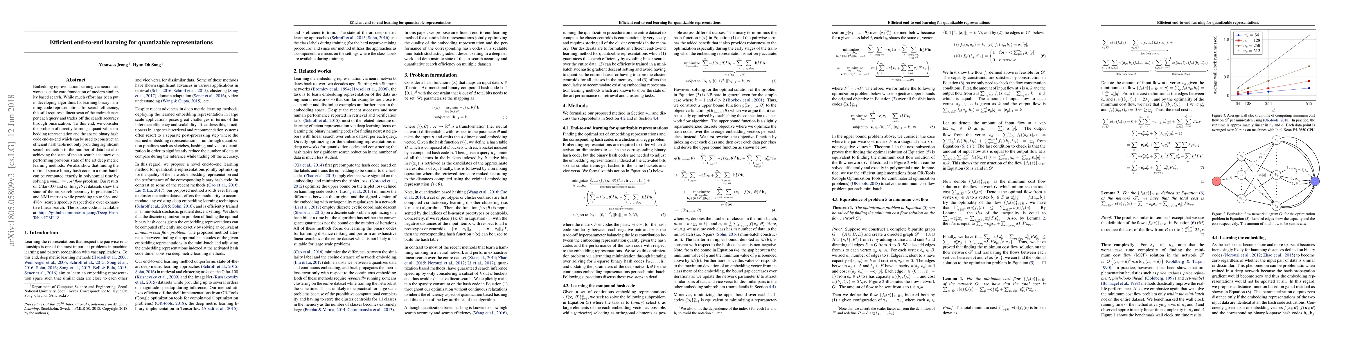 This paper proposes an efficient end-to-end learning method for quantizable representations that constructs sparse binary hash codes, achieving significant search speedup while maintaining state-of-the-art search accuracy on datasets like Cifar-100 and ImageNet. The method also solves a minimum cost flow problem to compute optimal hash codes in polynomial time.