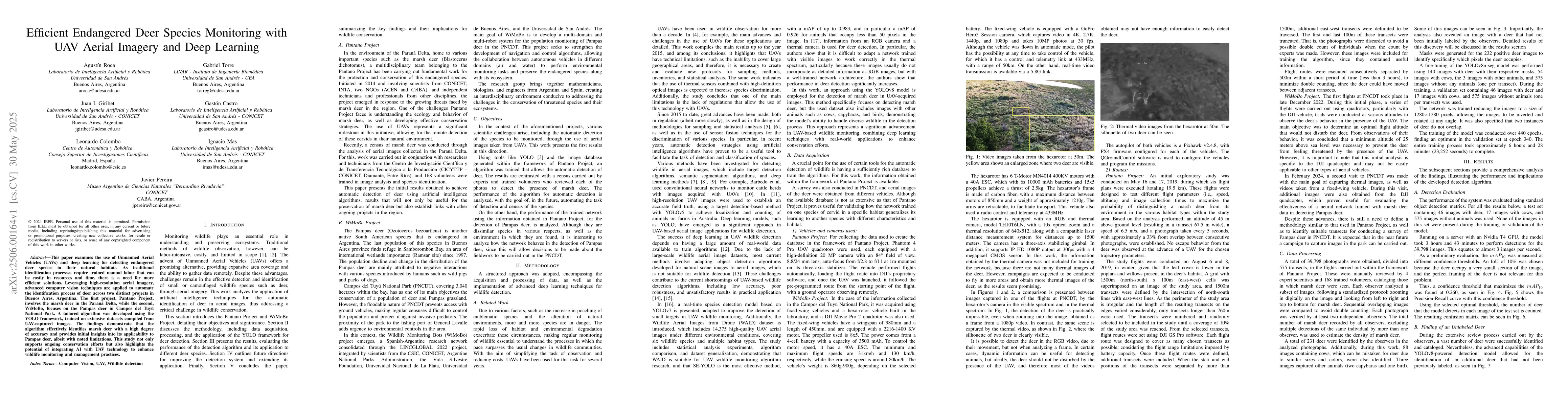 This paper examines the use of Unmanned Aerial Vehicles (UAVs) and deep learning for detecting endangered deer species in their natural habitats. As traditional identification processes require trained manual labor that can be costly in resources and time, there is a need for more efficient solutions. Leveraging high-resolution aerial imagery, advanced computer vision techniques are applied to automate the identification process of deer across two distinct projects in Buenos Aires, Argentina. The first project, Pantano Project, involves the marsh deer in the Paran\'a Delta, while the second, WiMoBo, focuses on the Pampas deer in Campos del Tuy\'u National Park. A tailored algorithm was developed using the YOLO framework, trained on extensive datasets compiled from UAV-captured images. The findings demonstrate that the algorithm effectively identifies marsh deer with a high degree of accuracy and provides initial insights into its applicability to Pampas deer, albeit with noted limitations. This study not only supports ongoing conservation efforts but also highlights the potential of integrating AI with UAV technology to enhance wildlife monitoring and management practices.