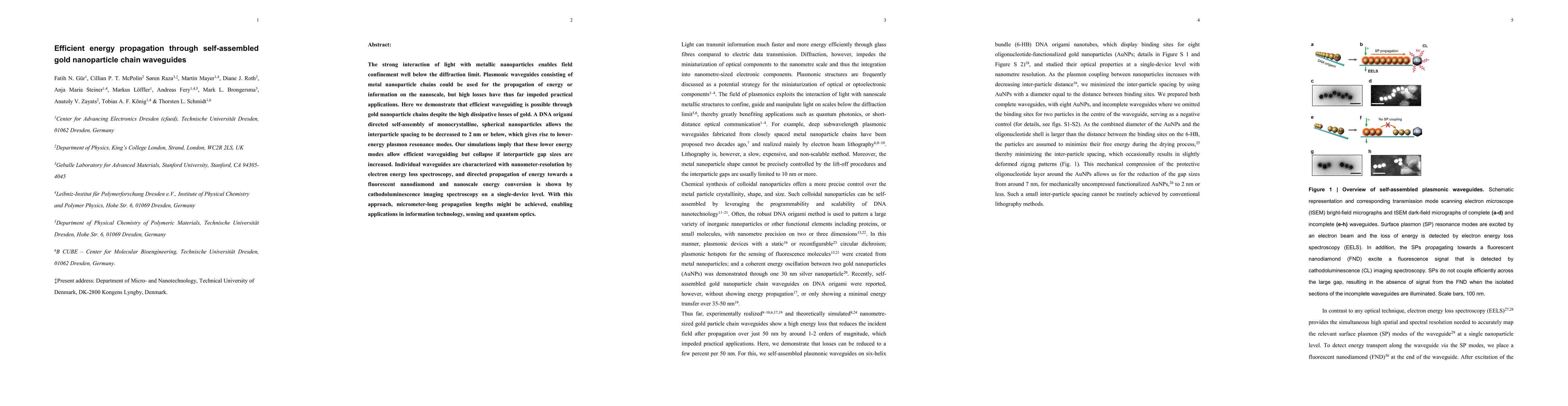This paper demonstrates efficient energy propagation through self-assembled gold nanoparticle chain waveguides, overcoming high dissipative losses by using DNA origami for precise nanoparticle arrangement. The study shows directed energy propagation and nanoscale energy conversion, suggesting potential applications in information technology, sensing, and quantum optics.