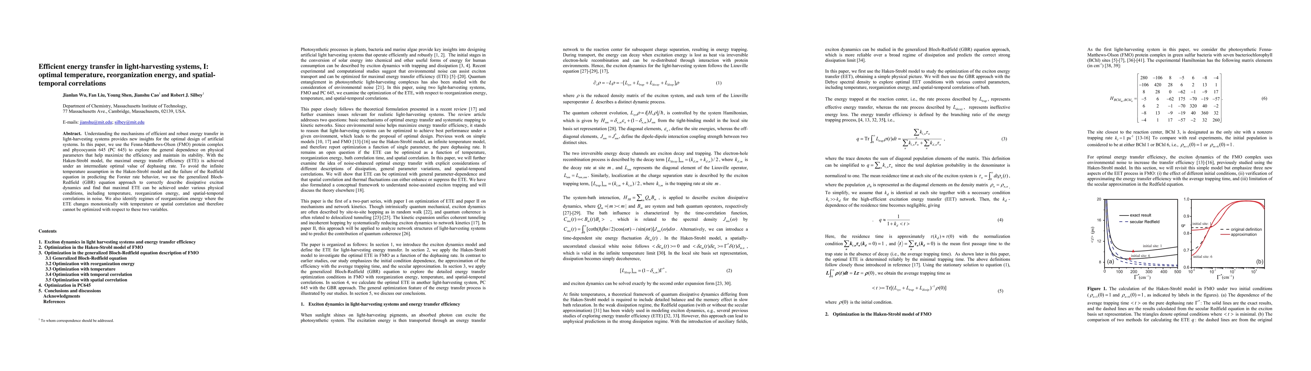 Researchers investigated optimal conditions for efficient energy transfer in light-harvesting systems, finding that maximal efficiency can be achieved under various physical parameters, including temperature and reorganization energy.