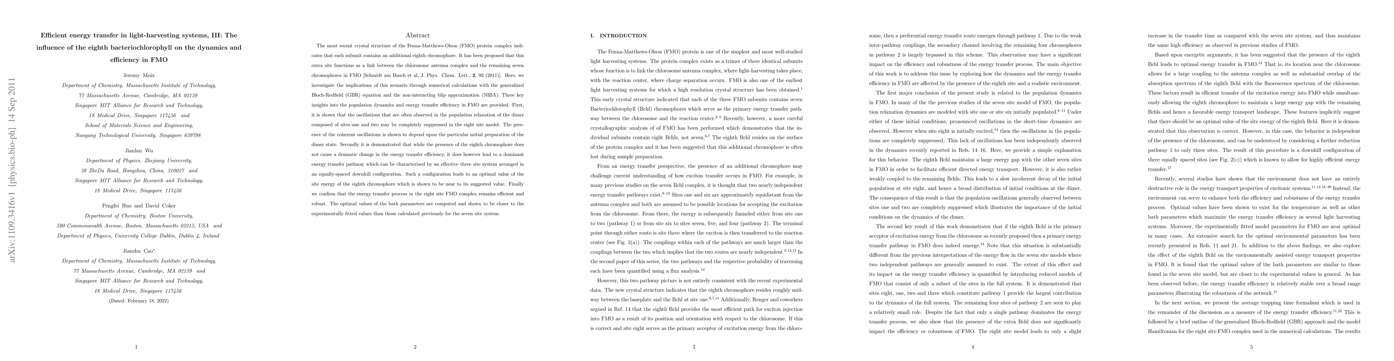 This paper investigates the impact of the eighth bacteriochlorophyll in the FMO protein complex using numerical calculations. It finds that the eighth chromophore suppresses oscillations in population dynamics and establishes a dominant three-site energy transfer pathway, maintaining overall efficiency and aligning optimal bath parameters with experimental values.