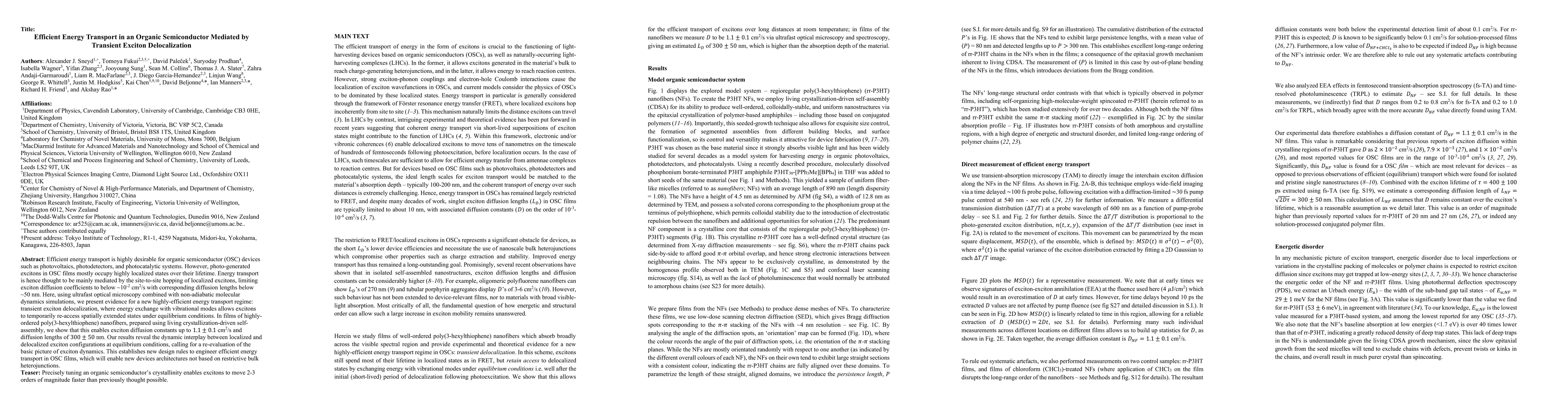 Efficient energy transport is highly desirable for organic semiconductor (OSC) devices such as photovoltaics, photodetectors, and photocatalytic systems. However, photo-generated excitons in OSC films mostly occupy highly localized states over their lifetime. Energy transport is hence thought to be mainly mediated by the site-to-site hopping of localized excitons, limiting exciton diffusion coefficients to below ~10^{-2} cm^2/s with corresponding diffusion lengths below ~50 nm. Here, using ultrafast optical microscopy combined with non-adiabatic molecular dynamics simulations, we present evidence for a new highly-efficient energy transport regime: transient exciton delocalization, where energy exchange with vibrational modes allows excitons to temporarily re-access spatially extended states under equilibrium conditions. In films of highly-ordered poly(3-hexylthiophene) nanofibers, prepared using living crystallization-driven self-assembly, we show that this enables exciton diffusion constants up to 1.1+-0.1 cm^2/s and diffusion lengths of 300+-50 nm. Our results reveal the dynamic interplay between localized and delocalized exciton configurations at equilibrium conditions, calling for a re-evaluation of the basic picture of exciton dynamics. This establishes new design rules to engineer efficient energy transport in OSC films, which will enable new devices architectures not based on restrictive bulk heterojunctions.