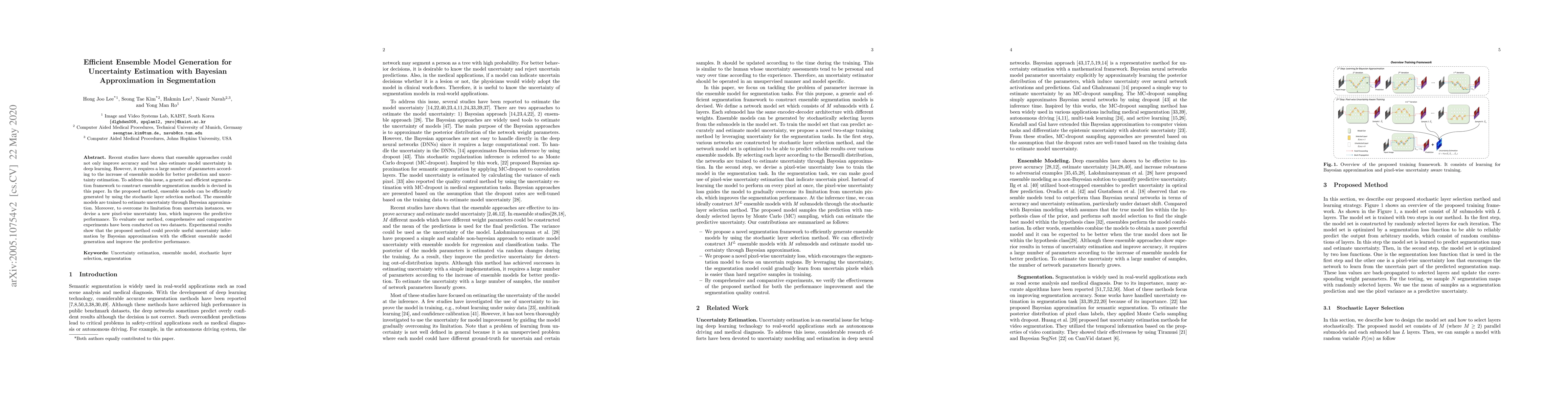 This paper proposes an efficient ensemble model generation framework for segmentation that uses stochastic layer selection to reduce parameter overhead. The ensemble models estimate uncertainty via Bayesian approximation and a new pixel-wise uncertainty loss, enhancing predictive performance, as demonstrated through comparative experiments on two datasets.
