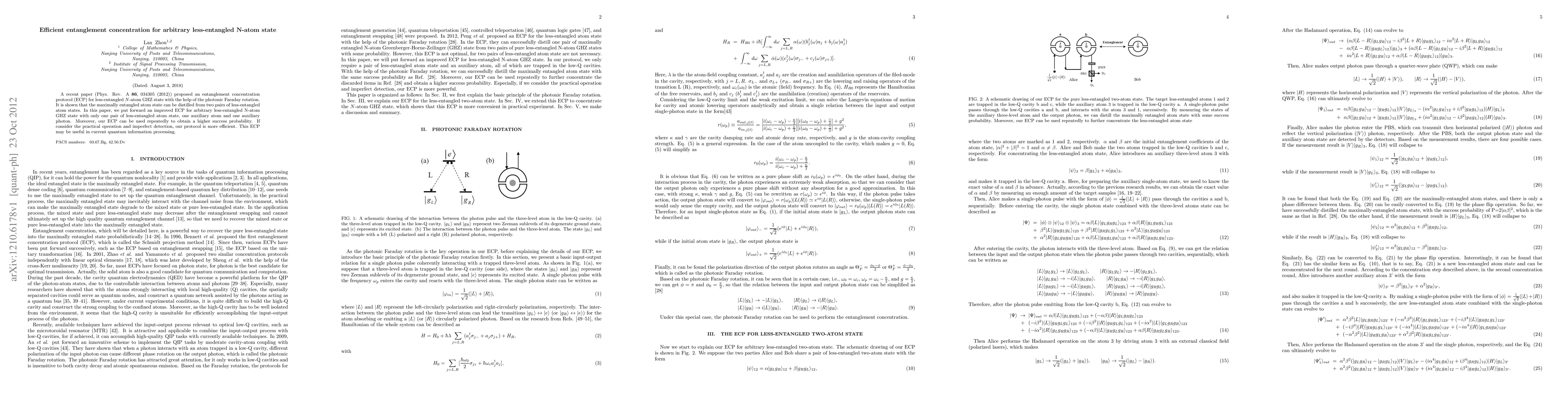This paper proposes an improved entanglement concentration protocol (ECP) for distilling maximally entangled states from arbitrary less-entangled N-atom GHZ states using only one pair of less-entangled atom states, an auxiliary atom, and an auxiliary photon. The protocol is more efficient and can be used repeatedly for higher success probability.