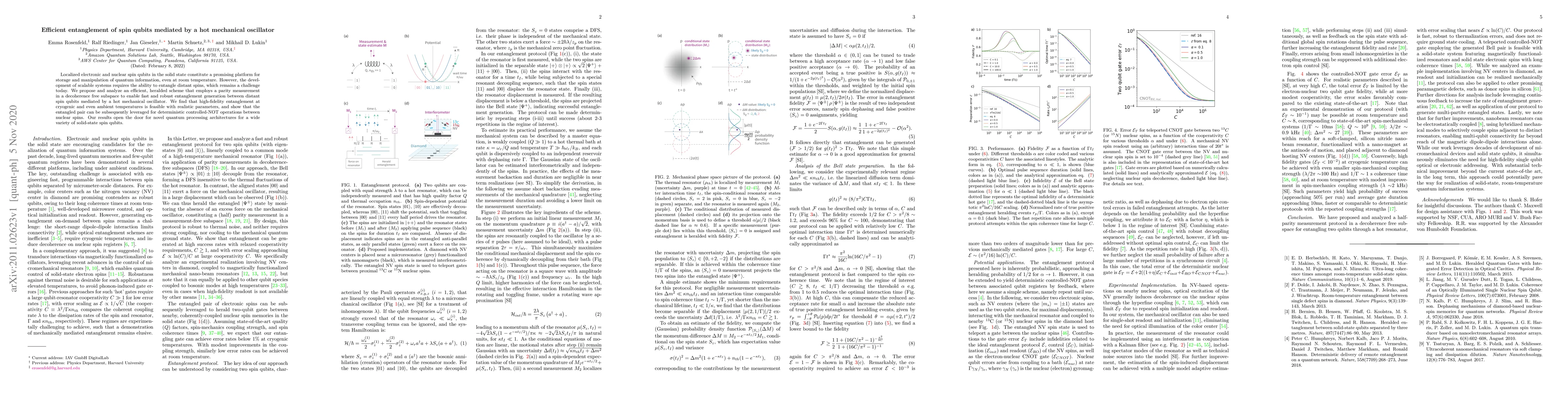 This paper proposes a method for efficiently entangling distant spin qubits using a hot mechanical oscillator and a parity measurement in a decoherence-free subspace, demonstrating high-fidelity entanglement at room temperature and enabling deterministic controlled-NOT operations. The findings suggest potential for scalable quantum processing architectures in solid-state spin qubits.