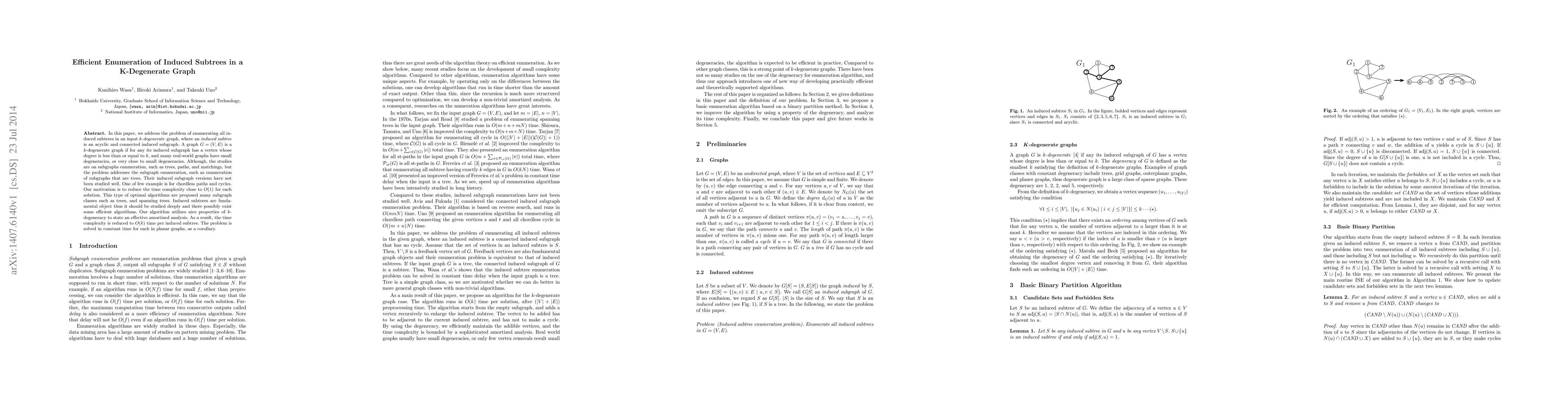 The paper presents an algorithm for enumerating all induced subtrees in a k-degenerate graph, utilizing properties of k-degeneracy for effective amortized analysis to reduce time complexity.