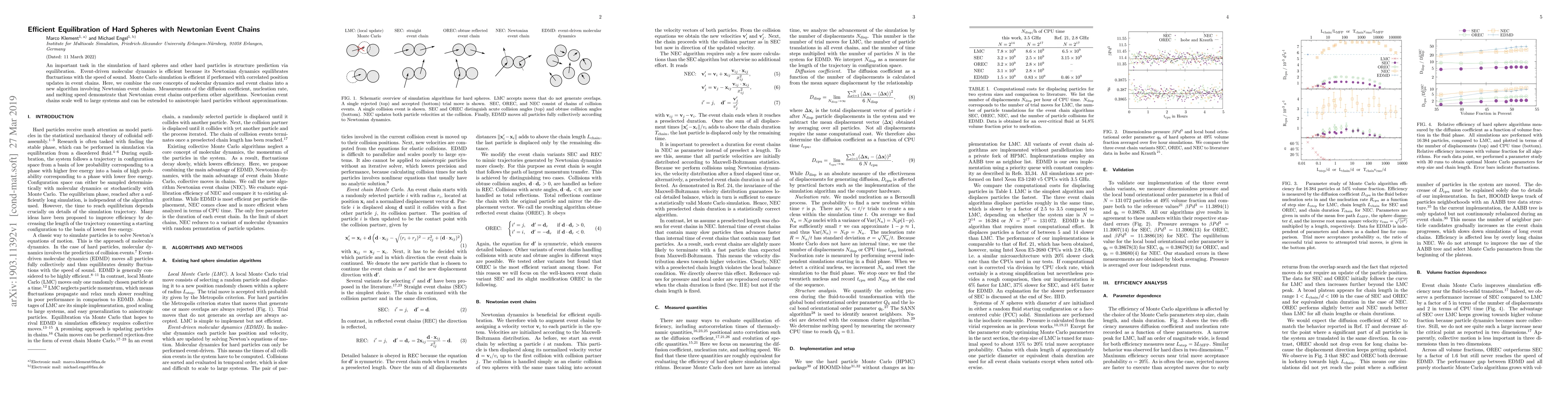 This paper introduces a novel algorithm combining molecular dynamics and event chains for efficient equilibration of hard spheres, showing superior performance in diffusion, nucleation rate, and melting speed compared to other methods. The proposed Newtonian event chains scale well and can be extended to anisotropic particles.