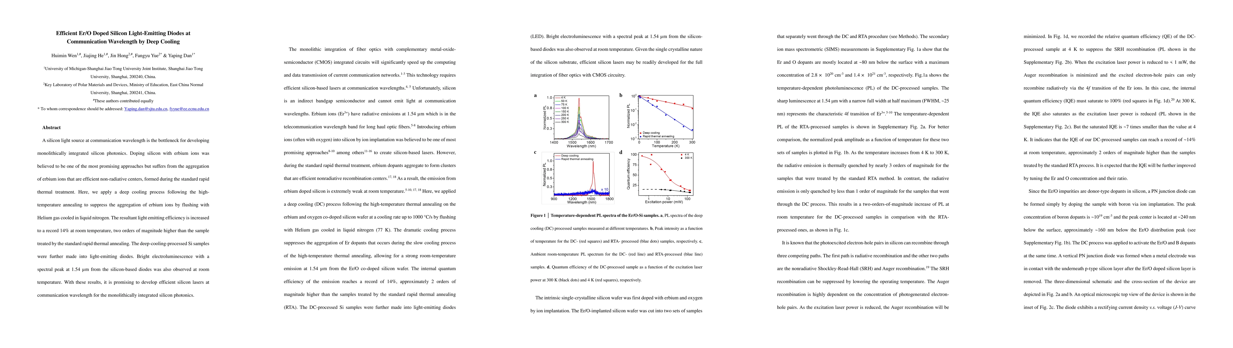 This paper explores the enhancement of silicon-based light-emitting diodes (LEDs) by doping with erbium and optimizing the annealing process through deep cooling. The deep cooling technique significantly reduces erbium ion aggregation, resulting in a record 14% light-emitting efficiency at room temperature, paving the way for efficient silicon lasers in integrated photonics.