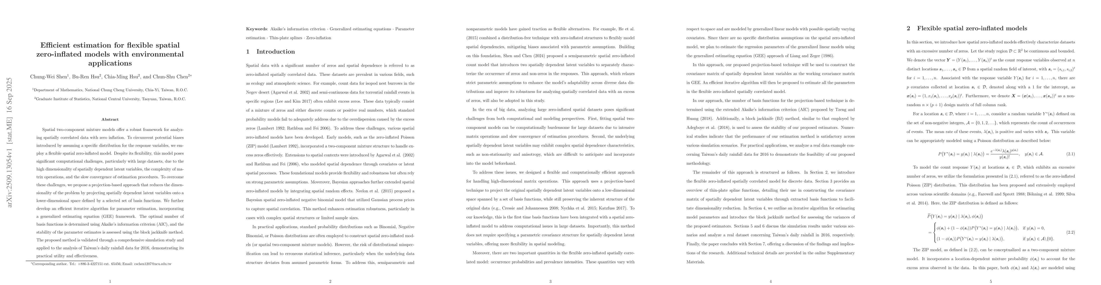 The work advances the GEE framework by incorporating a flexible thin-plate spline-based covariance structure, enabling efficient parameter estimation in large spatial zero-inflated count models.