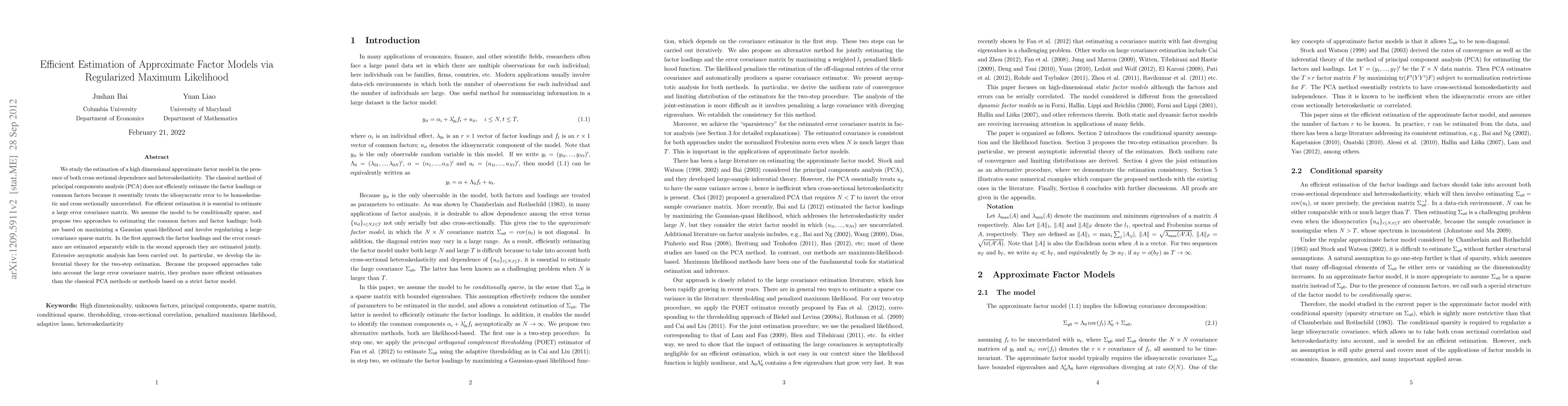 This paper proposes two regularized maximum likelihood methods for estimating high-dimensional approximate factor models that account for cross-sectional dependence and heteroskedasticity, outperforming classical PCA by considering a large error covariance matrix. Both methods maximize a Gaussian quasi-likelihood with a sparse covariance matrix regularization.