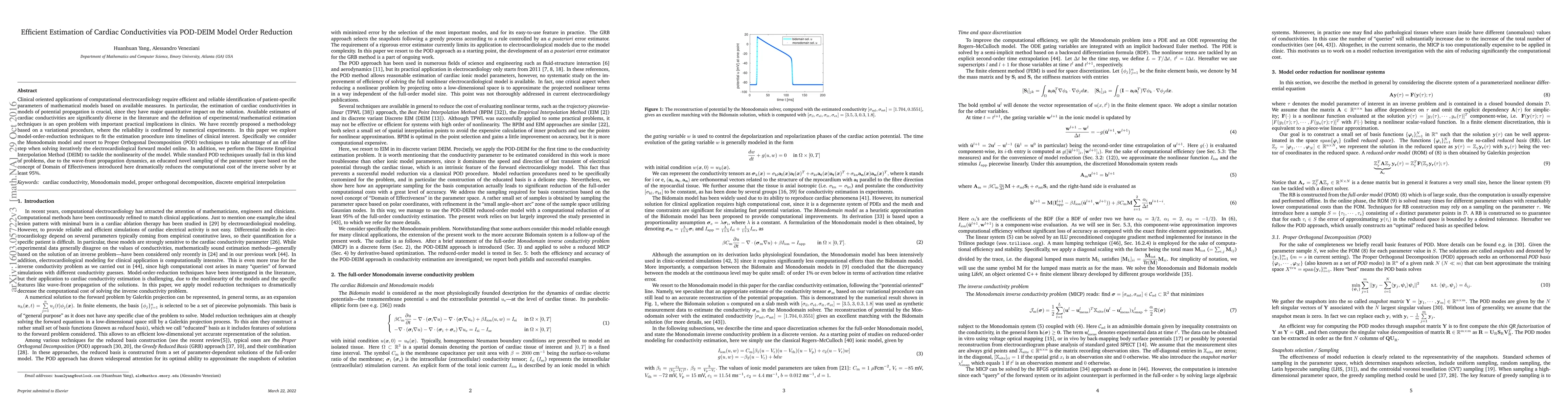 This paper proposes a model-order reduction technique using Proper Orthogonal Decomposition (POD) and Discrete Empirical Interpolation Method (DEIM) to efficiently estimate cardiac conductivities in Monodomain models, significantly reducing computational costs by at least 95% and fitting the estimation procedure within clinical timelines.