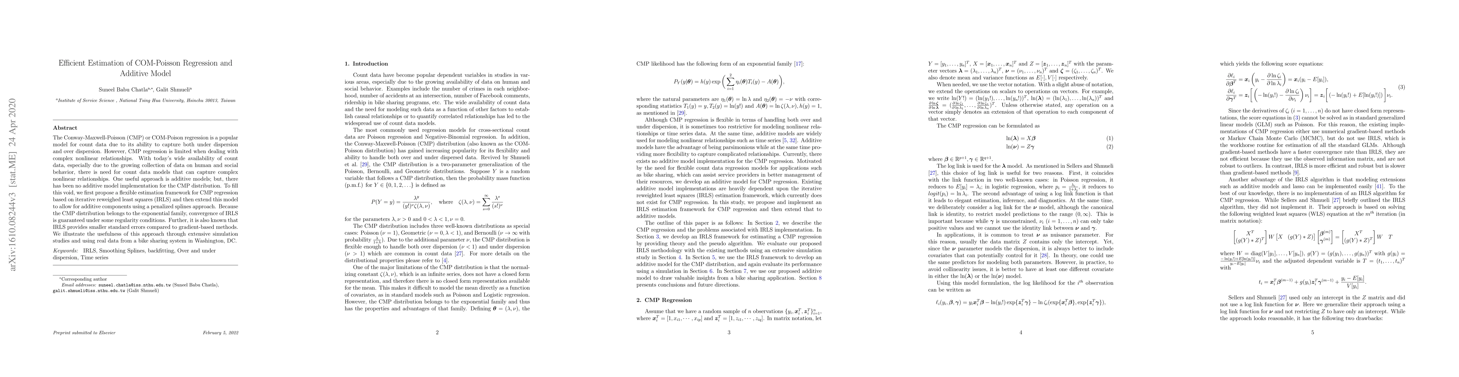 This paper proposes an efficient estimation framework for Conway-Maxwell-Poisson regression using iterative reweighted least squares (IRLS), and extends it to incorporate generalized additive components via penalized splines, addressing the need for models that can handle complex nonlinear relationships in count data. The approach is demonstrated through simulations and real-world data from a bike sharing system.