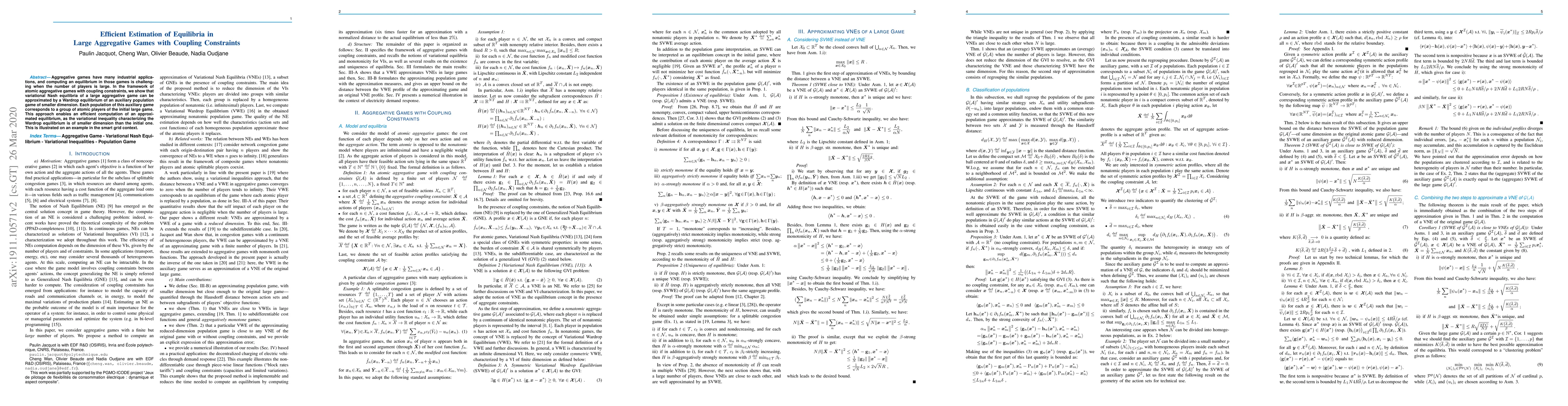 This paper proposes an efficient method for approximating equilibria in large aggregative games with coupling constraints by reducing the problem to a smaller auxiliary population game. The approach leverages the concept of Wardrop equilibrium to achieve computational efficiency.