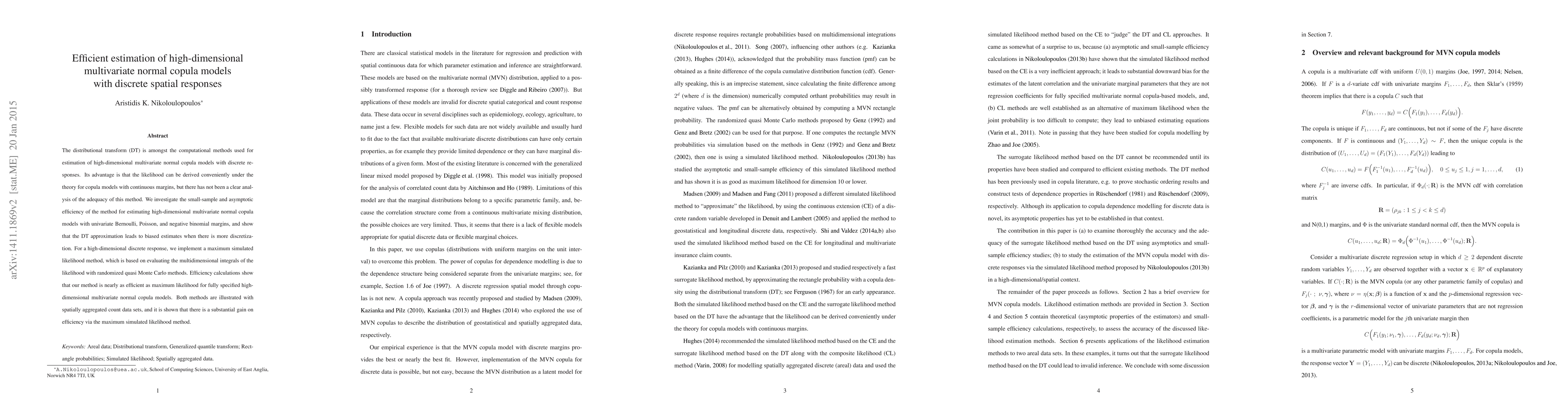 This paper evaluates the efficiency of the distributional transform method for estimating high-dimensional multivariate normal copula models with discrete spatial responses. It finds that the method leads to biased estimates with increased discretization and proposes a maximum simulated likelihood method, which shows nearly equivalent efficiency to maximum likelihood, with substantial gains demonstrated on spatially aggregated count data.