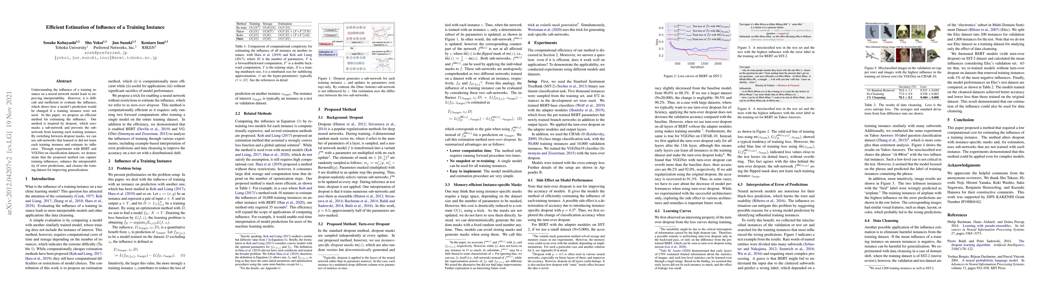 Understanding the influence of a training instance on a neural network model leads to improving interpretability. However, it is difficult and inefficient to evaluate the influence, which shows how a model's prediction would be changed if a training instance were not used. In this paper, we propose an efficient method for estimating the influence. Our method is inspired by dropout, which zero-masks a sub-network and prevents the sub-network from learning each training instance. By switching between dropout masks, we can use sub-networks that learned or did not learn each training instance and estimate its influence. Through experiments with BERT and VGGNet on classification datasets, we demonstrate that the proposed method can capture training influences, enhance the interpretability of error predictions, and cleanse the training dataset for improving generalization.